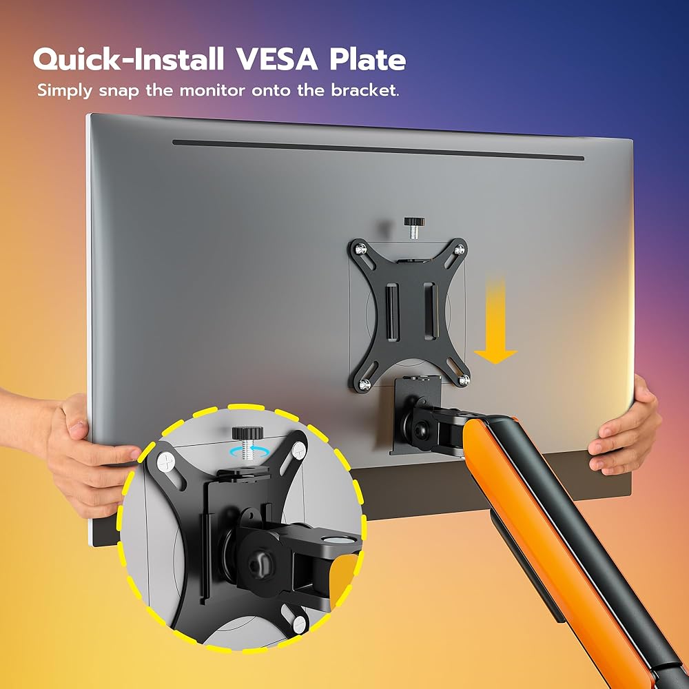 【سهل التركيب】مشبك على شكل حرف C يناسب سُمك المكتب من 0.4 إلى 3.1 بوصة، بينما يناسب الحامل ذو الحلقة المعدنية سُمك المكتب من 0.4 إلى 1.6 بوصة. يمكنك بسهولة تركيب حامل الشاشة ذو الذراع الواحد هذا باتباع التعليمات البسيطة والمفصلة وفيديو التثبيت الواضح. يسمح هيكل رأس الشاشة الخاص سريع التحرير بتجميع الشاشة بشكل أسهل، مما يجعلها سهلة الاستخدام بشكل خاص لأولئك الذين لديهم قوة أقل، مع وقت تركيب يقدر بـ 10 دقائق.
