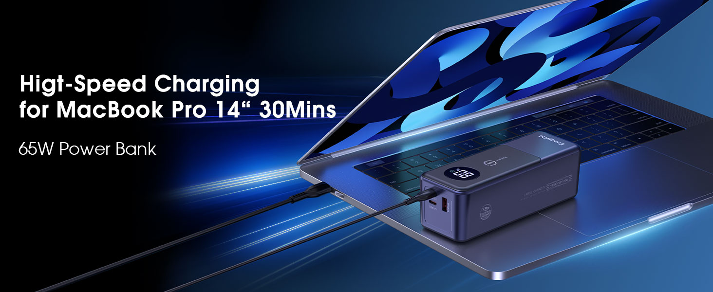 【شحن سريع لبنك الطاقة بقدرة 65 واط】يوفر مخرج PD Type-C القوي بقدرة 65 واط شحنًا سريعًا للغاية لمختلف الأجهزة، ويمكن لبنك الطاقة عالي الأداء هذا شحن MacBook pro من 0% إلى 50% في 30 دقيقة فقط، مما يضمن لك البقاء جاهزًا وجاهزًا. توجو.