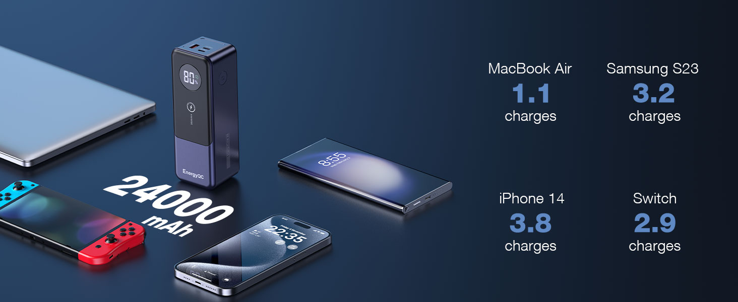 【سعة عالية 24000 مللي أمبير في الساعة】مع سعة هائلة تبلغ 88.8 وات في الساعة، يمكن لبنك البطارية توفير iPhone (12Wh) حتى 6 مرات، وMacBook(58Wh) حتى 1.1 مرة، وiPad (25Wh) حتى 3 مرات، وSteam Deck (40Wh) حتى إلى 1.5 مرة، وهو مثالي للعمل والسفر. (يُرجى العلم أن قوة بنك الطاقة هذا تبلغ 88.8 وات في الساعة، وهو ما يلبي متطلبات إدارة أمن المواصلات الأمريكية (<100 وات في الساعة) ليتم اصطحابه على متن الطائرات كأمتعة محمولة.)