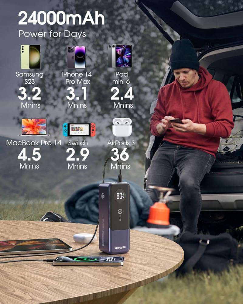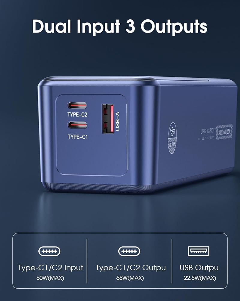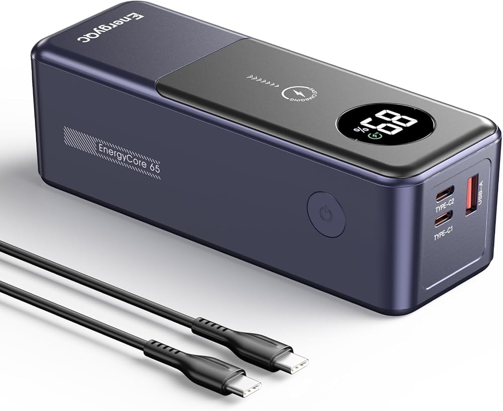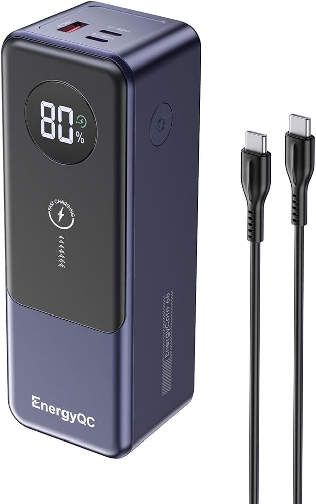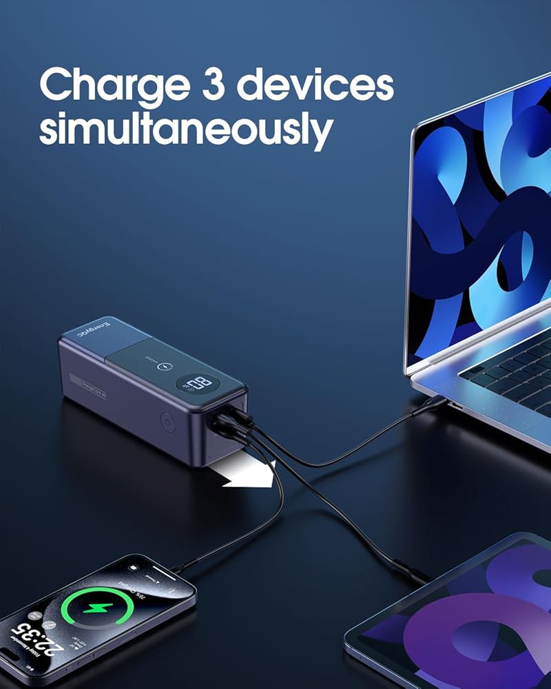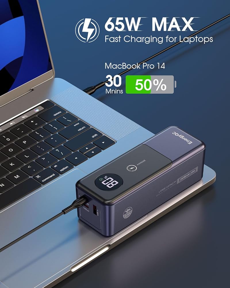 【بنوك طاقة متعددة الاستخدامات للاستخدام متعدد الأجهزة】بنوك الطاقة المحمولة للكمبيوتر المحمول EnergyQC تشحن 3 أجهزة في وقت واحد، النوع C 1/2 يدعم الإخراج بحد أقصى 65 وات و60 وات بحد أقصى، ويدعم USB A بحد أقصى 22.5 وات. سرعة الشحن أسرع 4 مرات من بنك البطاريات التقليدي الآخر، مما يضمن أنه يمكنك شحن الكمبيوتر المحمول والهاتف والكمبيوتر اللوحي في وقت واحد بأقصى سرعة.