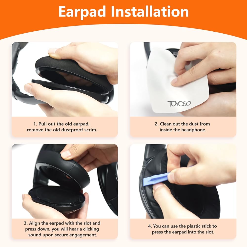 التعبئة والتغليف الكامل: تشتمل عملية الشراء الخاصة بك على زوج من وسائد الأذن، وزوج من السجادات العازلة للصوت، وقطعة قماش للتنظيف، وعتلتين، وأداة مثلثة. لدينا دليل فيديو خطوة بخطوة للاستبدال بدون متاعب، وصندوق مصمم خصيصًا لتخزين وسائد الأذن البديلة في حالة عدم الاستخدام.