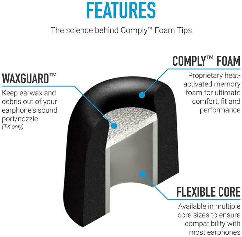 • ENHANCED COMFORT - Super-Soft Memory Foam reduces earphone irritation and fatigue while reducing outside noise. Comply foam is 30x softer than silicone tip material so you have the most comfortable earphones