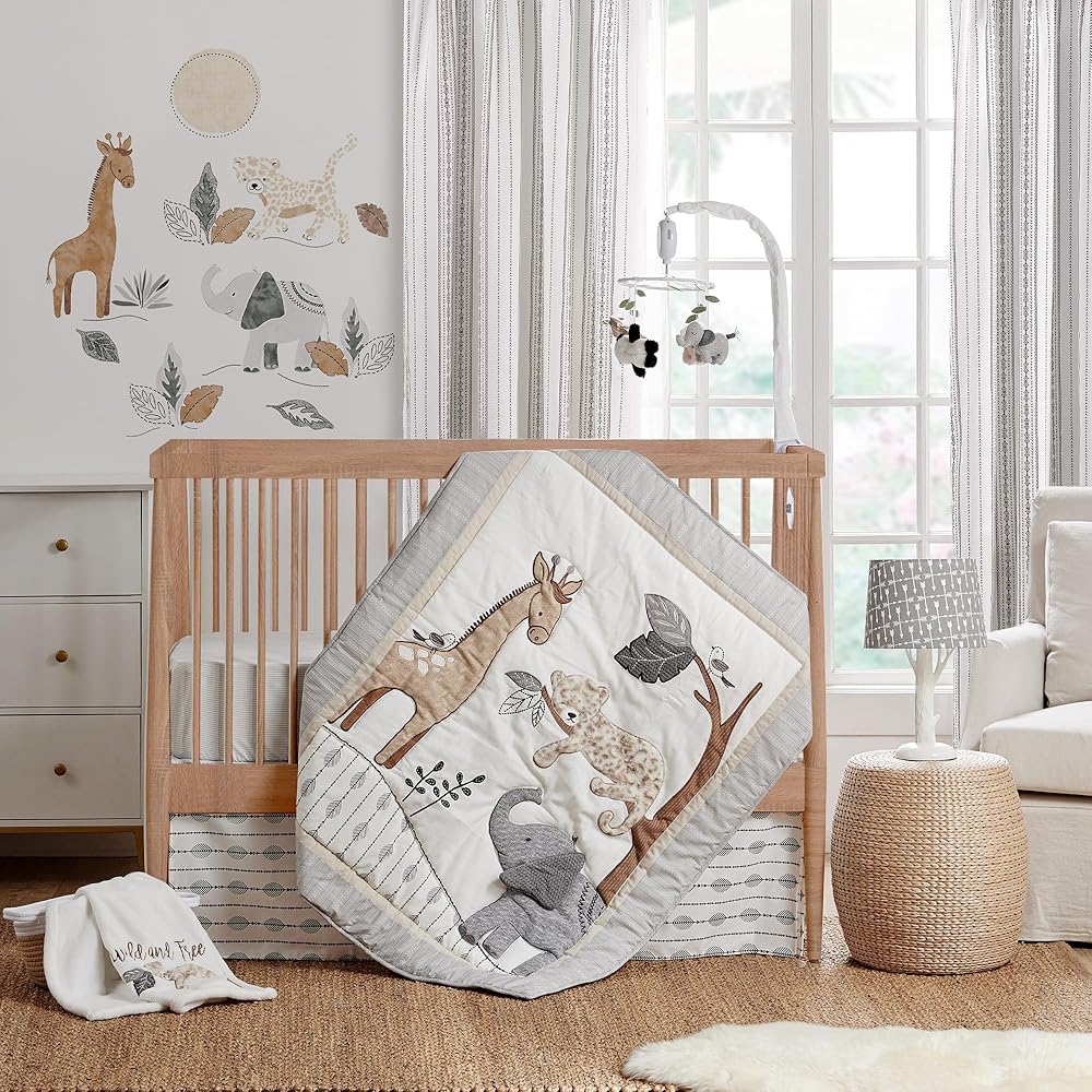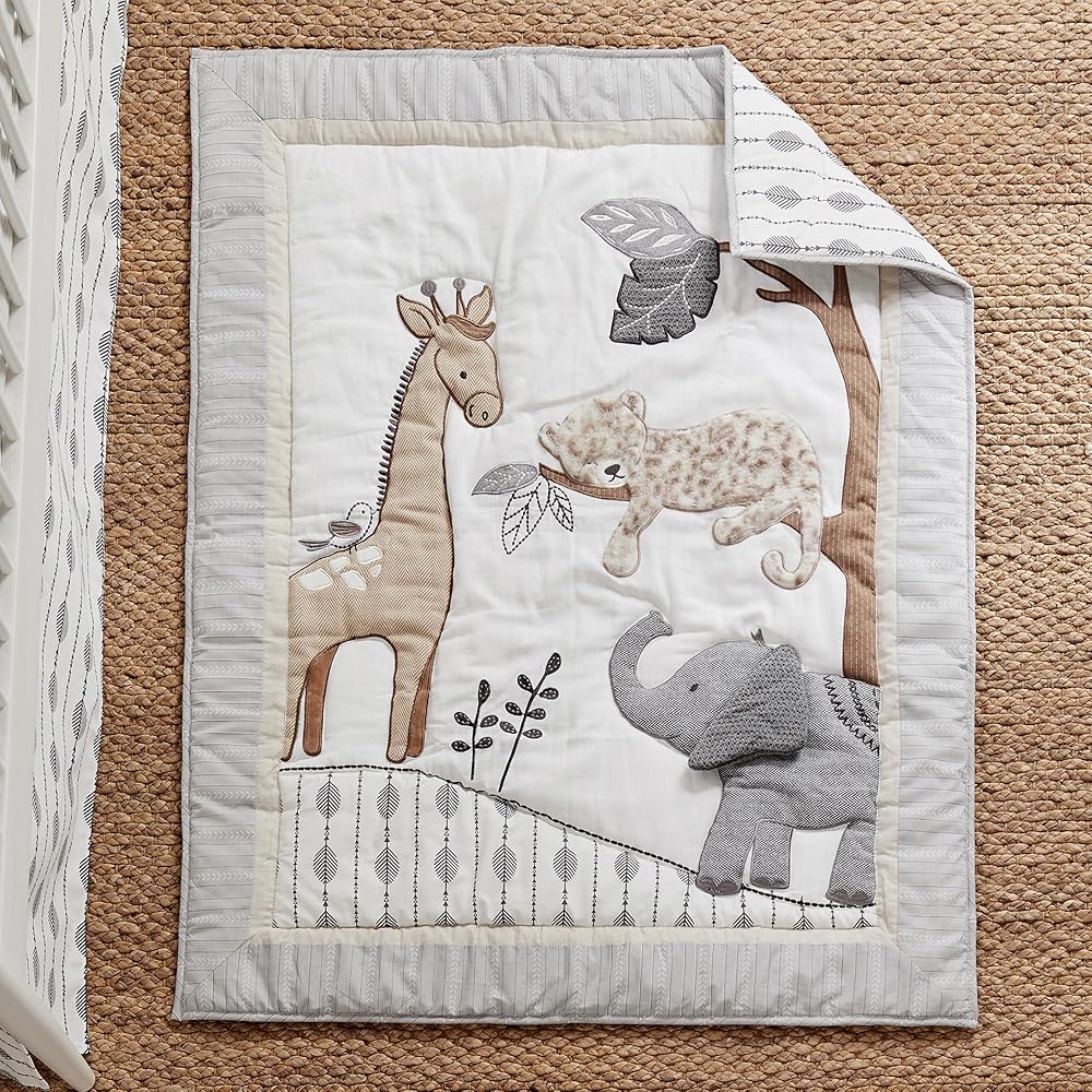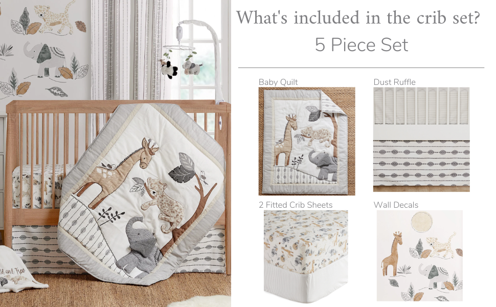 Levtex Baby - طقم سرير أطفال Serengeti - مجموعة حضانة الأطفال - رمادي داكن وأبيض وبني كريمي وفحمي - أصدقاء الغابة - مجموعة مكونة من 5 قطع تتضمن لحافًا وملاءتين مناسبتين وملصقات حائط وتنورة/كشكشة غبار