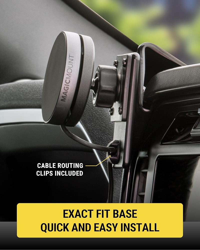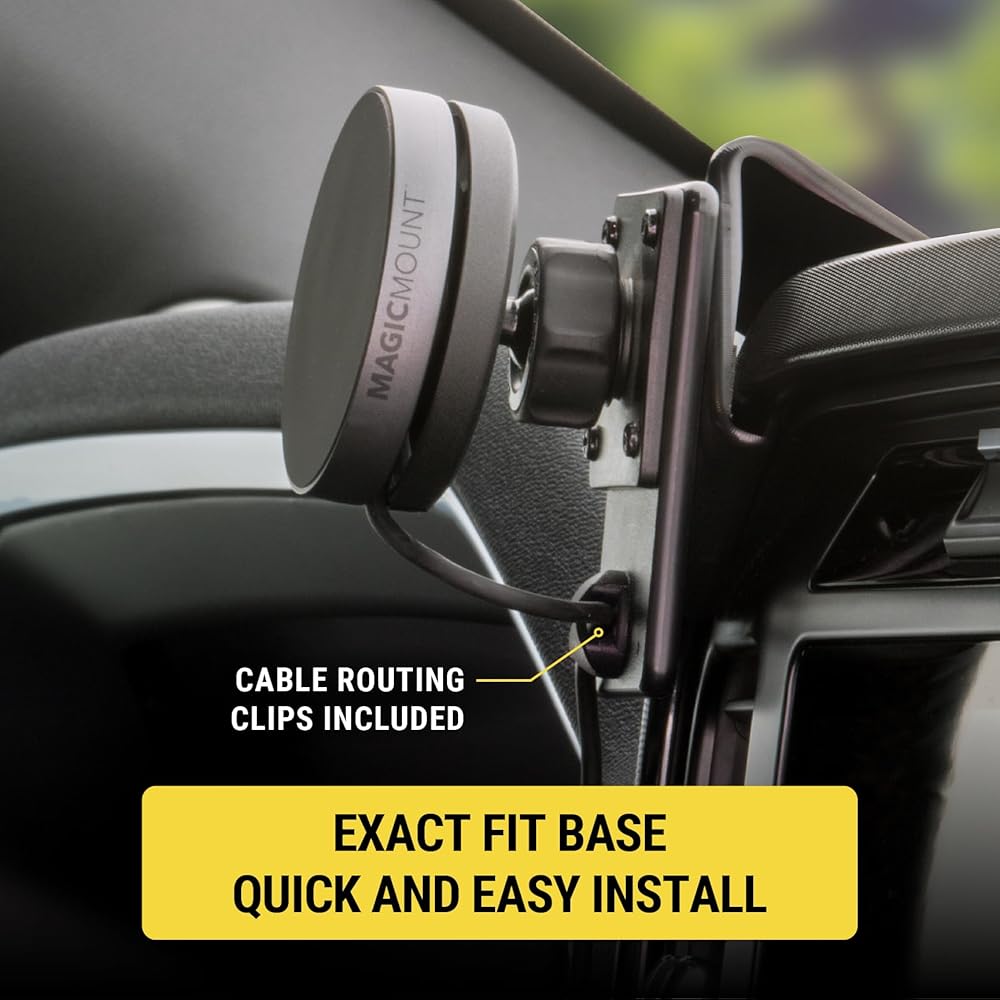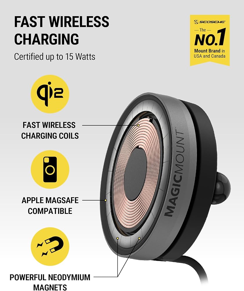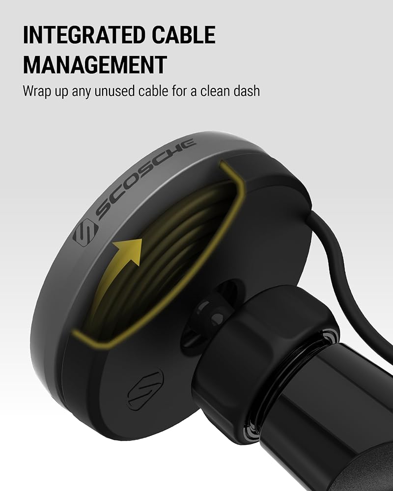 The Scosche MEQMRAMPS-UB MagicMount Charge Elite with AMPS Adapter seamlessly integrates with your vehicle's dashboard, providing a reliable and efficient solution for both charging and mounting your devices. Featuring an AMPS Mounting Plate compatible with Scosche/ProClip Vehicle Specific Mount Bases, this car phone mount ensures a precise fit and easy installation tailored to your specific vehicle. With Qi2 15W Wireless Charging, it delivers up to 2X faster charging speeds compared to standard 7.5W Qi chargers, making it perfect for iPhone 12 and later MagSafe models. The magnetic mounting design allows for effortless phone placement and removal, while the mount head features an innovative integrated cable management system. This clever design, along with the included cable management clips, securely holds your charging cable in place, preventing tangles and clutter and ensuring your setup remains streamlined and efficient. Enjoy a cleaner, more professional look in your car, truck, or van with this convenient cable management solution, enhancing both functionality and aesthetics. The mount also includes an integrated ball joint swivel, allowing you to adjust to your perfect viewing angle for seamless navigation or quick notification checks. The wireless car charger mount includes a dual USB-C port 20W car charger for efficient wireless charging on the go, making it an ideal choice for anyone seeking a reliable and fast wireless phone charger mount for car. Compatible with MagSafe iPhone models 12 and later, Android, and other Qi-enabled devices, this wireless charger phone holder is a must-have for every driver. Note: iPhone 12 Mini charges at 12W per Apple specs.