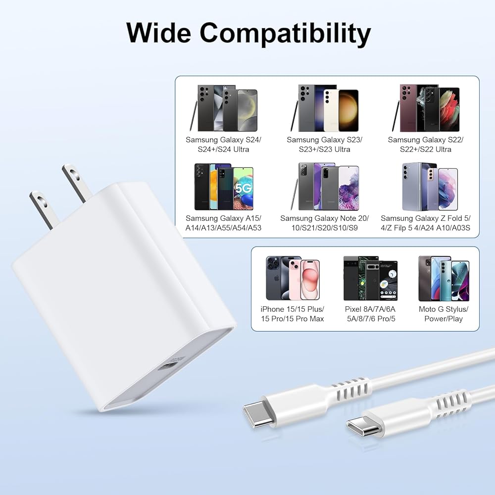 25W higher power than a standard USB C charger, the perfect quick charger compatible with Moto Edge 2024,G Stylus 5G 2024 Edge 50 Ultra, iPhone 15/15 Pro/15 Plus/15 Pro Max, Samsung, Google, LG, Moto, and more, charge your Galaxy S24 S23 A15 A55 A14 A54 5G up to 50% in just 30 minutes.