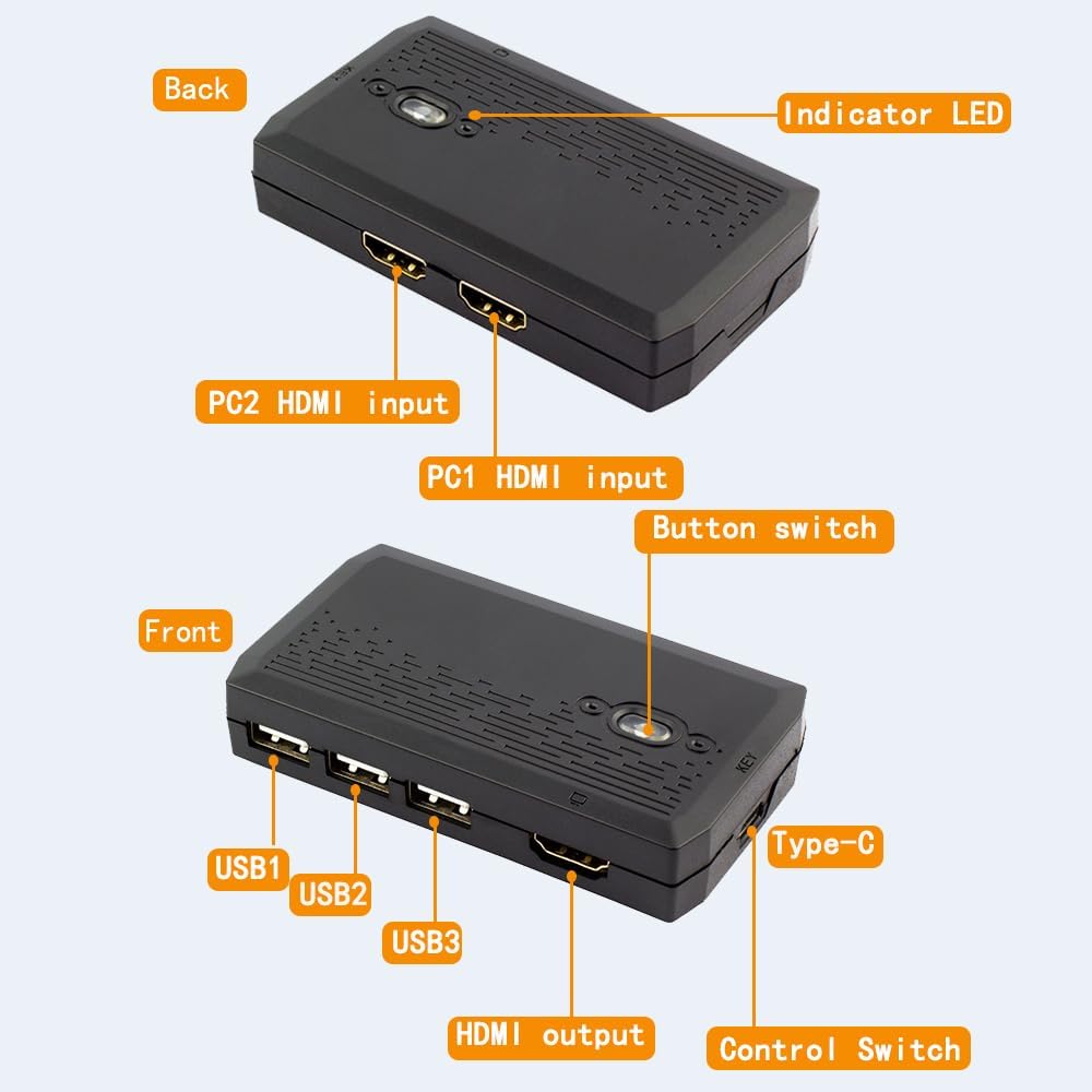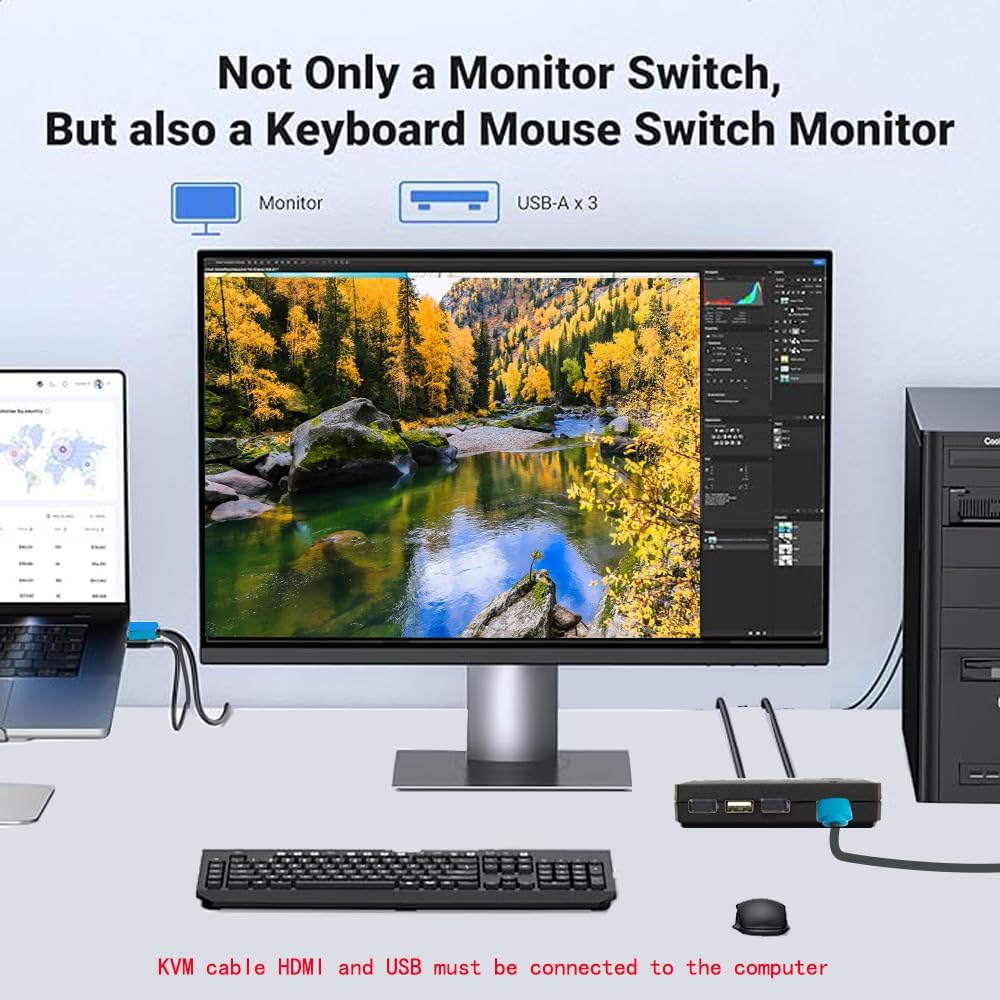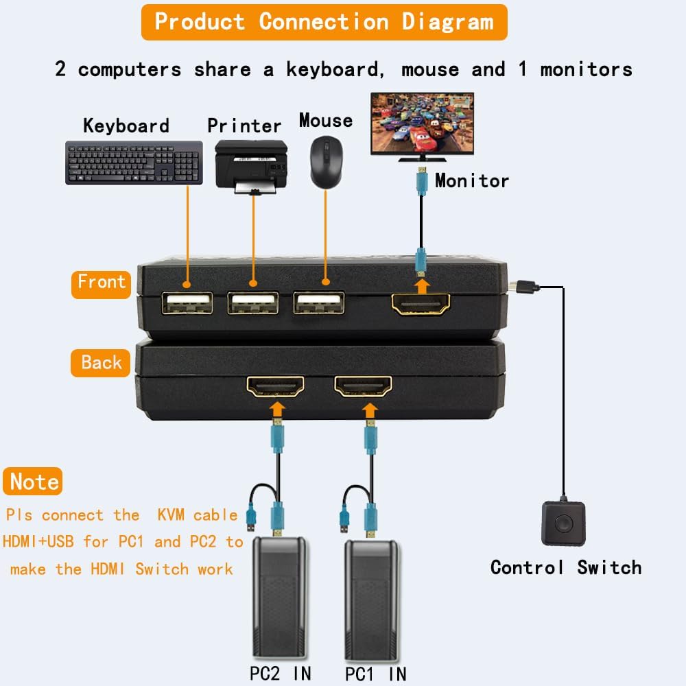 【USB KVM HDMI Switch Box】This HDMI KVM Switch allows you to control 2computers with only one set of USB devices (Monitor, Mouse, Keyboard and Printer). You can easily switch between two displays with one button-pressing,it is not only a monitor switch but also a keyboard mouse switch. 【Ultra HD 4K@60HZ Visual Enjoyment】This USB HDMI KVM switch supporting resolution 4K@60Hz, also supports 1080P or lower resolution, mainly depending on the computer's original resolution.Support for 4K@60HZ ensures crystal-clear image quality for your visual experience