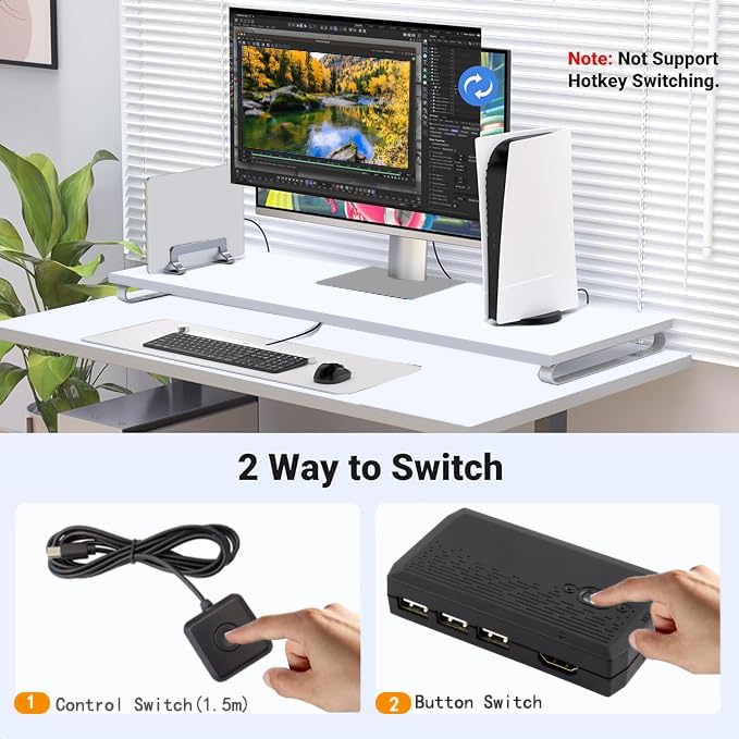 This 2Port KVM Switch can control 2PCS to share 1 monitor with 1 set of keyboard and mouse. You can quickly switch between two computers by simply pressing the switch button or wire-desktop controller. the KVM SWITCH supports 4K resolution at a smooth 60Hz. It can be widely used in education, studio, office, and other fields. Please Note: This product does NOT support hotkey switching