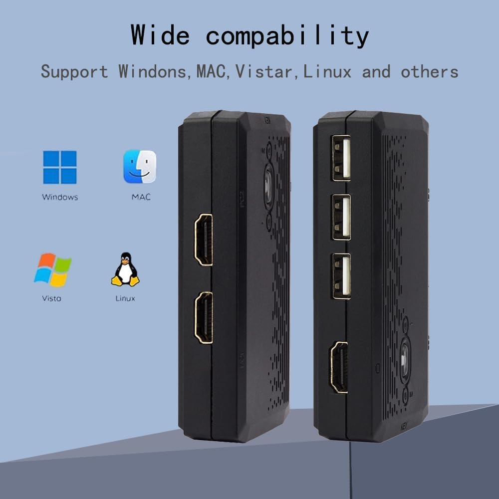 Easy Switch & Greater Compability】 Easily switch between 2 computers with a single click on the button or wired controller. This KVM switches works with greater compatibility driver-free for Windows 10/8/8.1/7/Vista/XP and Mac OS, Linux, and Chrome OS, simply plug and play, No external power required. 【Free UP Your Desk Space】 kvm switch save your desk space when you need to use two computers,you can easily switch between 2 computers and usb devices without all the clutter. No need to plug and unplug hdmi cable and usb cable back and forth anymore,making your work much more convenient and efficient.