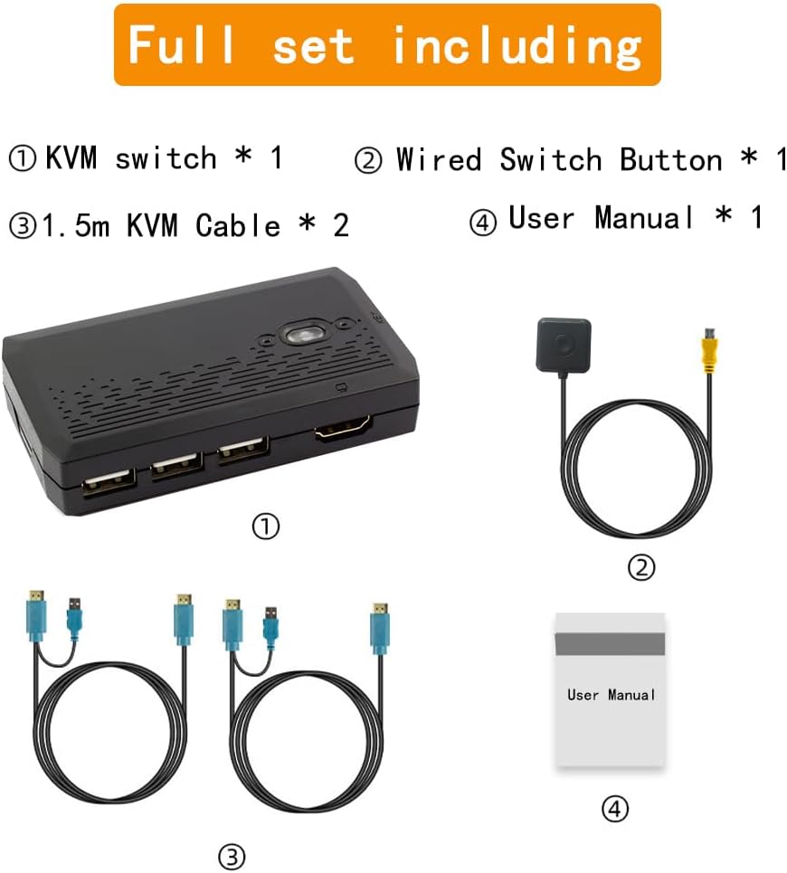 【Package and Warranty】Our kvm switches comes with 2 pack 150cm KVM cable and no need to spend extra money on cables.What You Get: 1*KVM Switch, 2*kvm cable, 1*wire-desktop cable1*User manual,If any issue,please contact us to solve
