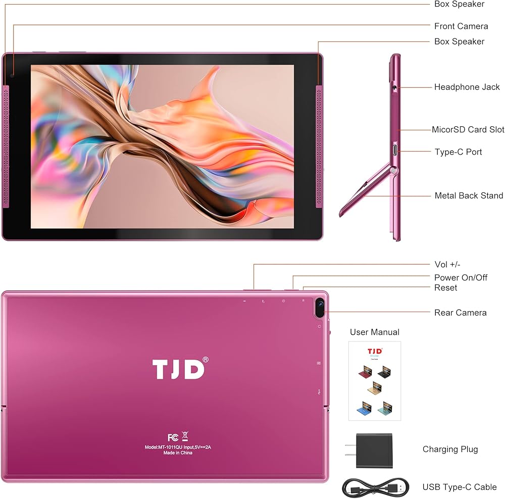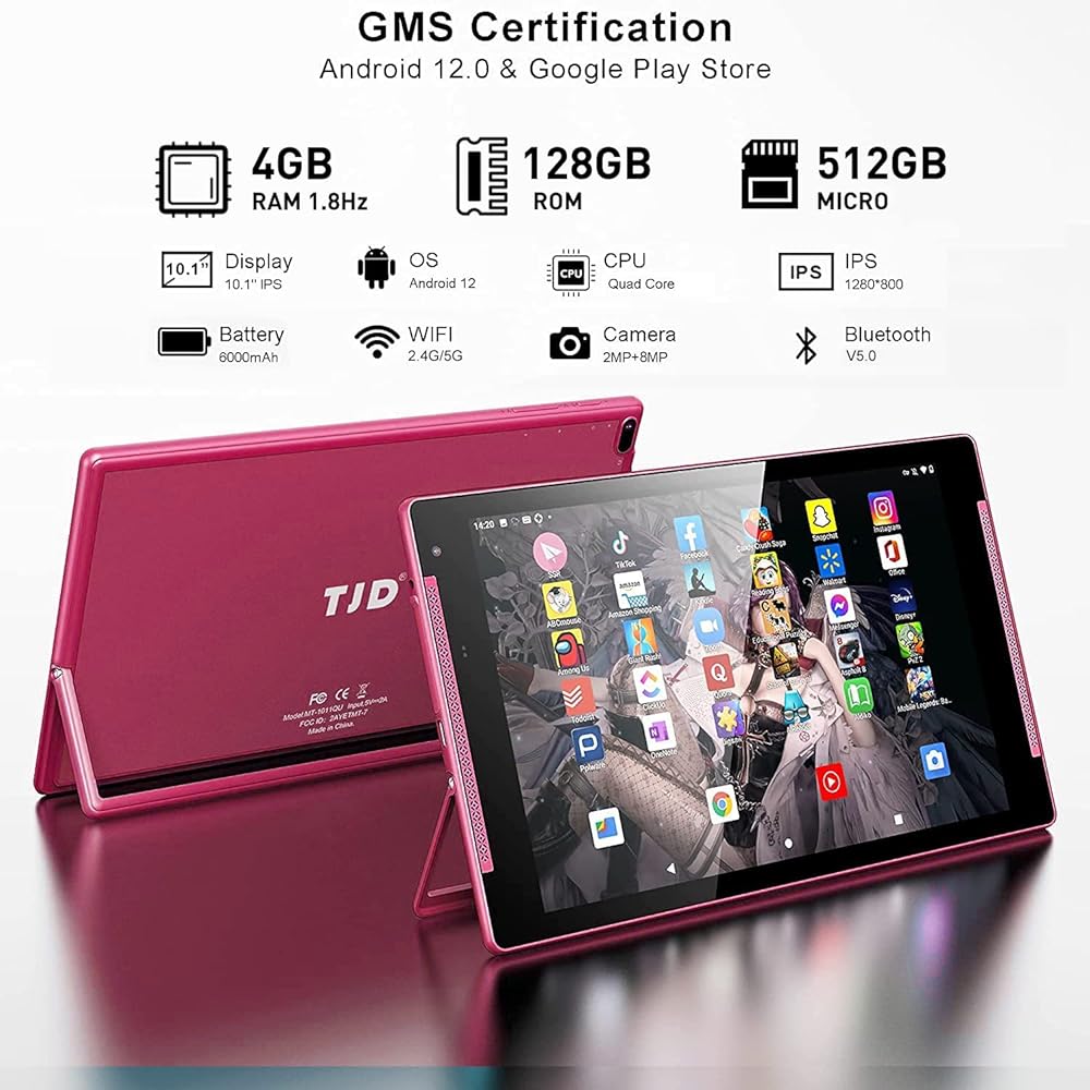 تابلت TJD Android 12 مقاس 10.1 بوصة مع حامل، ذاكرة وصول عشوائي 8 جيجابايت، ذاكرة تخزين داخلية 128 جيجابايت، 512 جيجابايت قابلة للتوسيع، شحن سريع 6000 مللي أمبير في الساعة، كاميرا مزدوجة 8 ميجابكسل، 2.4 جيجا/5 جيجا WiFi6، شاشة لمس IPS HD (وردي)
