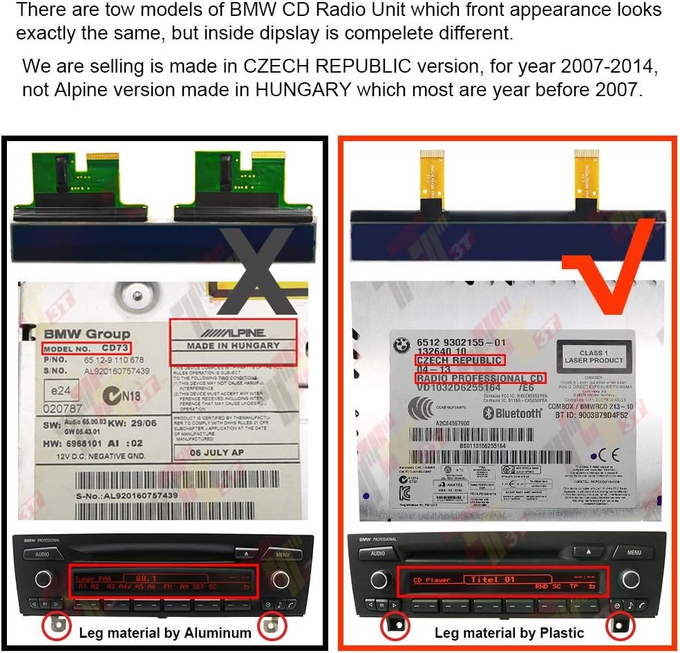 Please note: If the white tag on your radio says "CD73" then this is not the right auction for you! Please make sure your Professional CD Radio Unit is made by Czech Republic and has "RADIO PROFESSIONAL CD" label like red pointed in picture. At years before 2007, the CD73 of which CD Radio Unit front appearance looks exactly the same, but inside display is compelete different. Please move out the radio and check the label on body to make sure you choose correct display for your car!