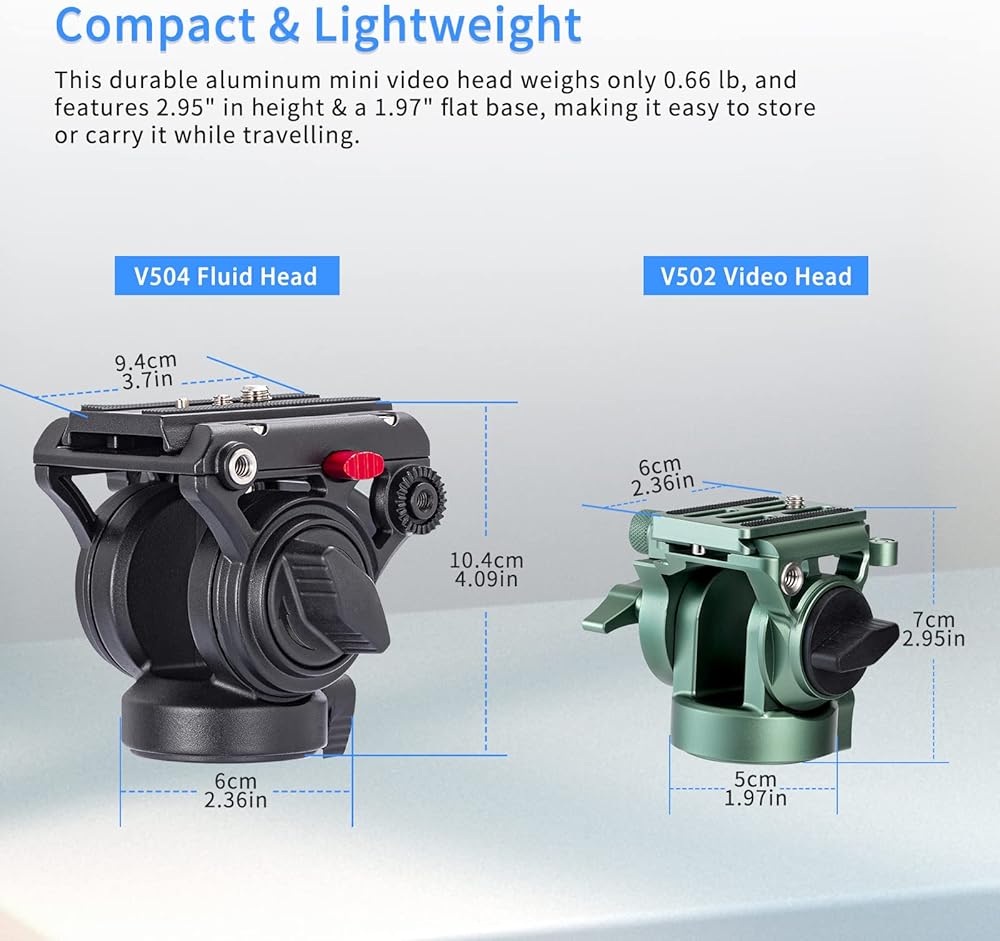 【صغير ومحمول】V502 عبارة عن رأس فيديو صغير الحجم. يزن رأس الفيديو هذا 0.3 كجم/0.66 رطل فقط، ويتميز بارتفاع 70 مم/2.75 بوصة وقطر 50 مم/1.97 بوصة في القاعدة. حجم صغير للغاية، سهل الاستخدام للغاية ويسهل أخذه للسفر أو الفيديو الصغير.
