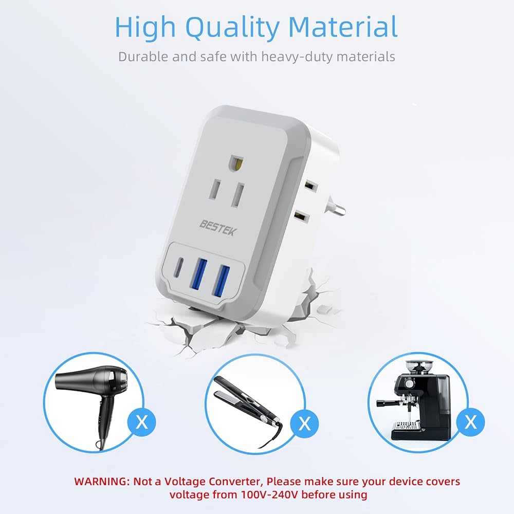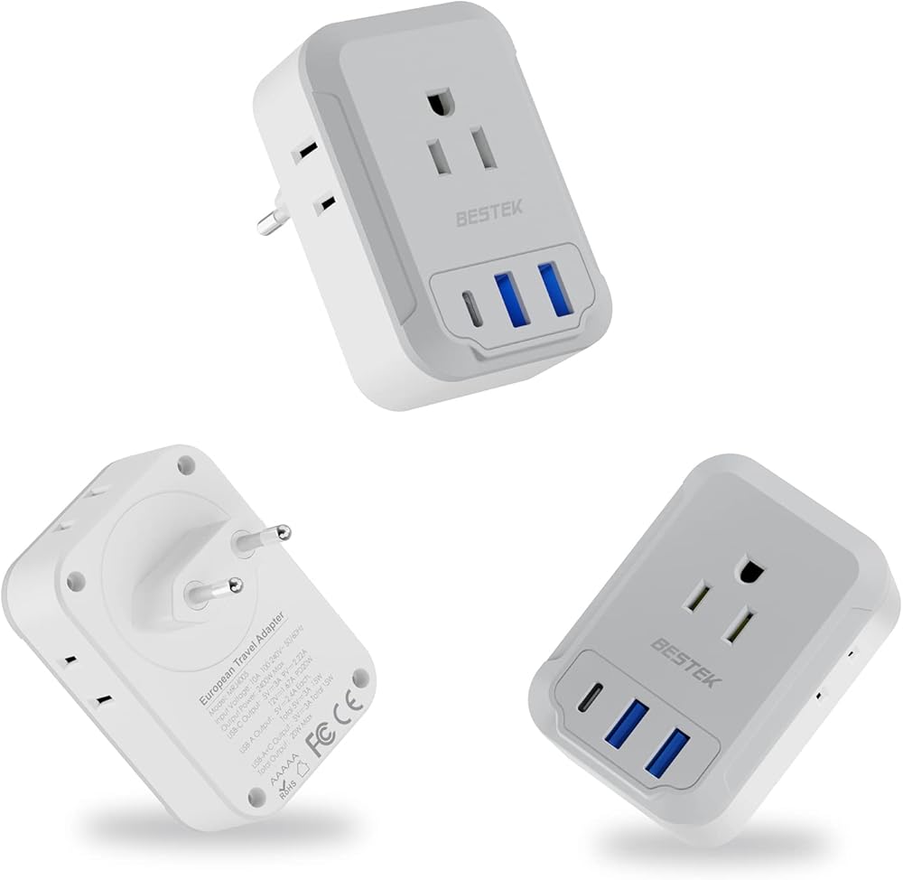 محول السفر BESTEK: الخيار الأفضل في أمريكا للمسافرين الدوليين على أمازون. نقدم لكم أحدث محول قابس السفر الأوروبي لدينا، والذي يتميز بمقبس متعدد الاستخدامات من النوع C مع تصميم 7 في 1 - الرفيق المثالي للسفر والعمل في الاتحاد الأوروبي.