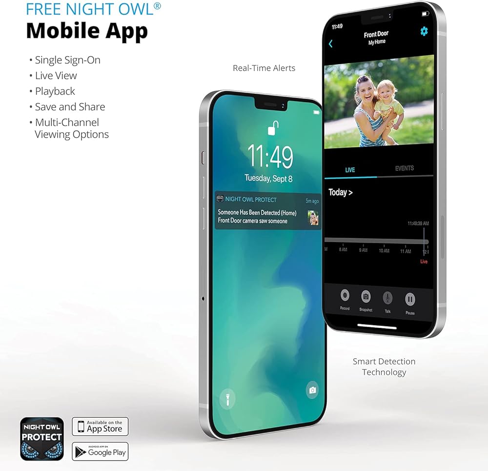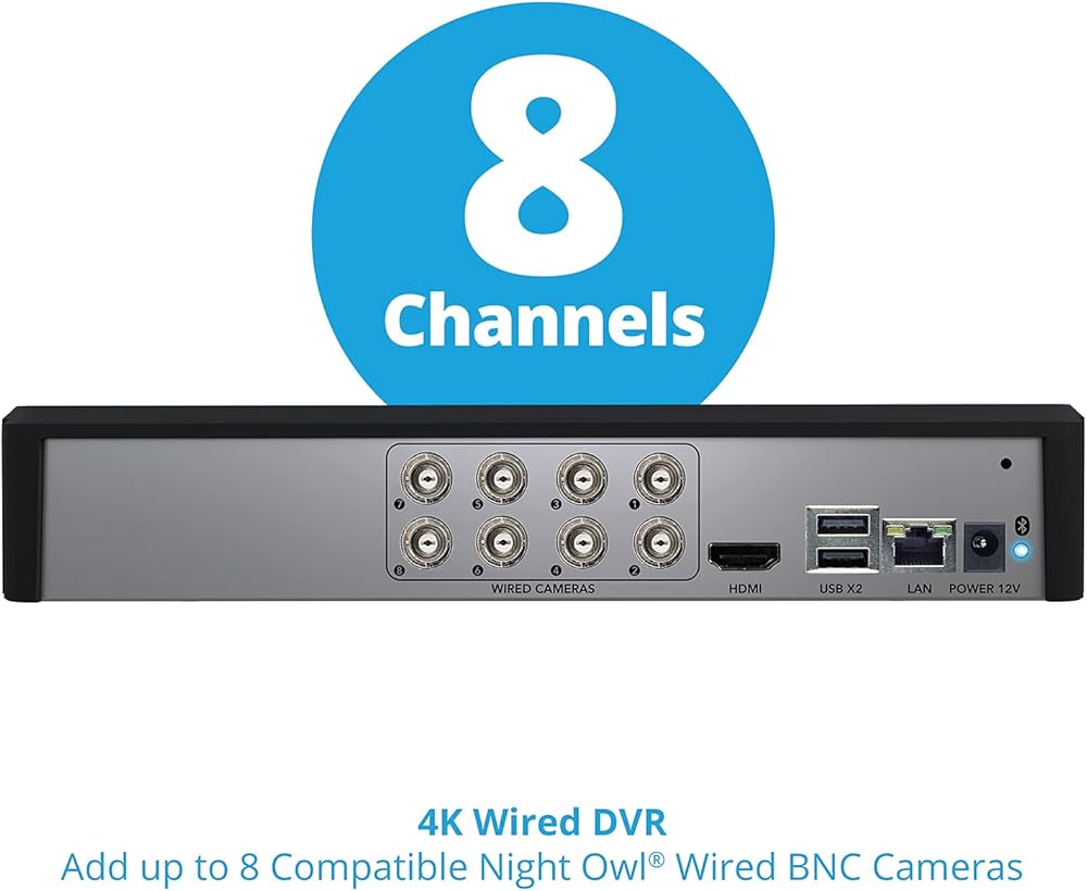Night Owl® is excited to offer our U.S. designed and engineered 4K UHD 8 Channel Wired Bluetooth® Digital Video Recorder with 1TB Hard Drive. With Secure App-Based Bluetooth® Setup, there is no need to connect a TV or monitor for setup or viewing. You can easily configure your system right from the app on your smartphone or tablet with the Bluetooth® connection. While a TV or monitor is not required, with Google Assistant you can use simple voice commands to stream camera footage directly to your TV or monitor, all while remaining hands free. When used with compatible cameras, Smart Detection Technology including Human Detection, Facial Capture, and Vehicle Alerts reduce the risk of false alarms, keeping you safe and well protected. Facial Capture lets you see who is on your property by snapping a photo and sending the image to your Smart Device. Proudly designed and engineered in the U.S.A., our security DVR uses a wired connection for uninterrupted viewing with no delays. Our app gives you control of your DVR and easy access to your recordings, regardless of where you are. Night Owl® never charges fees for storage or access to your videos. All recordings are stored on a hard drive with 1TB of storage. You can view and download the recordings as you need them. This system provides the latest technology to give you the ultimate security experience. NOTE: This DVR is compatible with our DP2 or DP8 Series Wired Cameras and WNIP2 or WNIP8 Series Wi-Fi devices and is not backward compatible with other Night Owl® products.