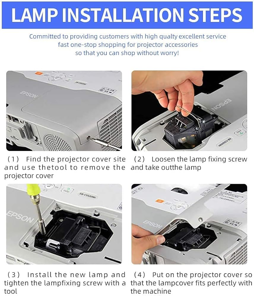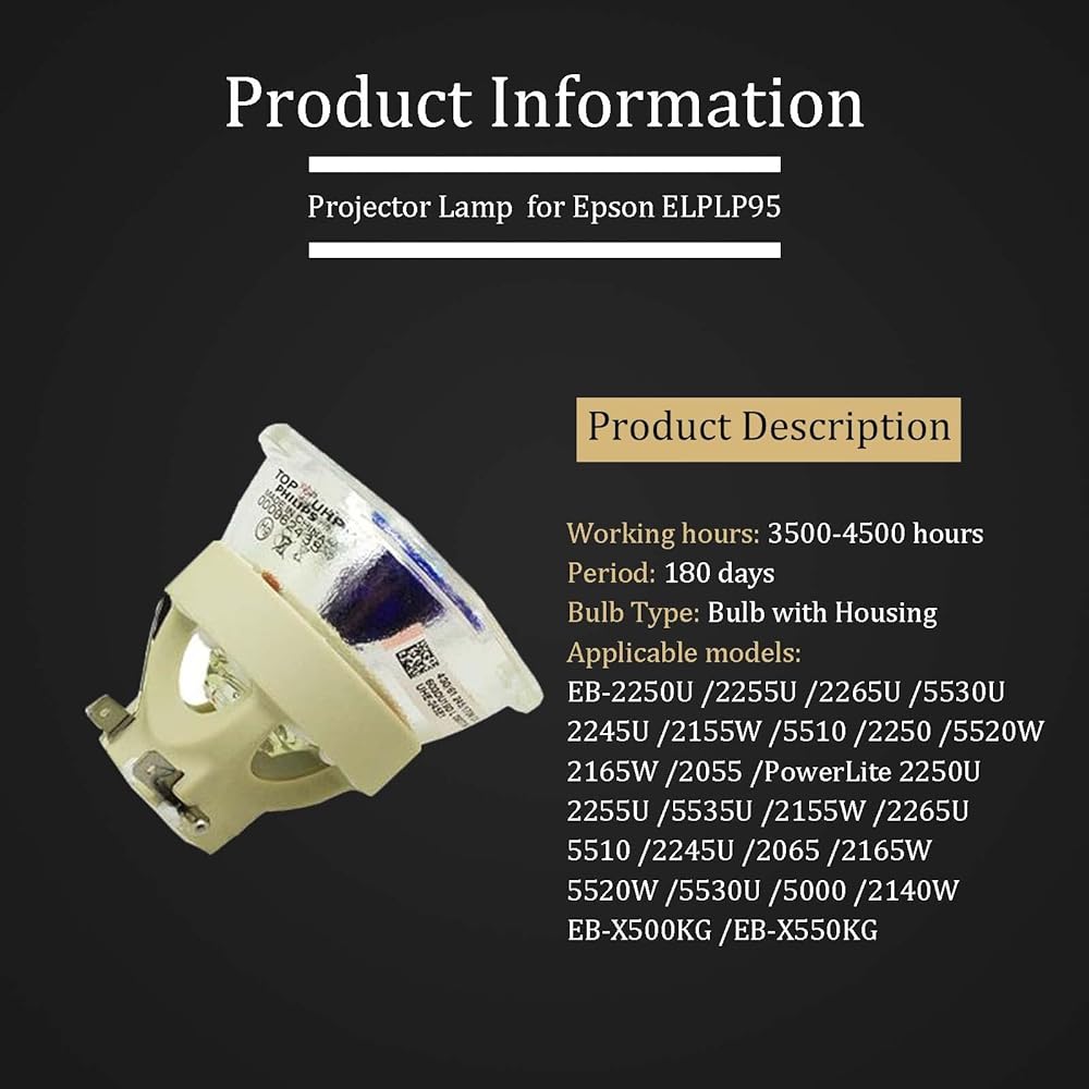 Bulb model: ELPLP95/V13H010L95 Bulb Type: Bulb with Housing Applicable models: For EB-2250U EB-2255U EB-2265U EB-5530U EB-5535U EB-2245U EB-5520W EB-5510 EB-2250 EB-2165W EB-2155W EB-2055 EB-2065 EB-2155 EB-X500KG EB-X550KG, PowerLite 5535U /PowerLite 5530U /PowerLite 5520W /PowerLite 5510 /PowerLite 5000 /PowerLite 2265U /PowerLite 2255U /PowerLite 2250U /PowerLite 2245U /PowerLite 2165W /PowerLite 2155W /PowerLite 2140W /PowerLite 2065 /PowerLite 975W /PowerLite 1450 /PowerLite Home Cinema 1450 V13H010L95 projector lamp performs the high definition pictures like you are at the cinema. Durable lamp life,more clear pictures makes you feel no negative effects on operating and matching your projector. With a economical and healthy conditon when you are using it. This is a lamp with housing, very easy and covenient for intalling. We also offer you simple intallation guide in our product detailed description. We always be here to assist you when you got any probems. Projector Lamp Description and Service: It is the lamp with housing, Same as bright and durable lamp wick as the original bulb. All our projector lamps have taken strict quality checks for beam performance, connections, voltages, and run-time, so you can trust it to work flawlessly in your projection. Furthermore, we will provide a 180-day of after service , If you have any technical, damaged, or other problem , we will try our best to help you.