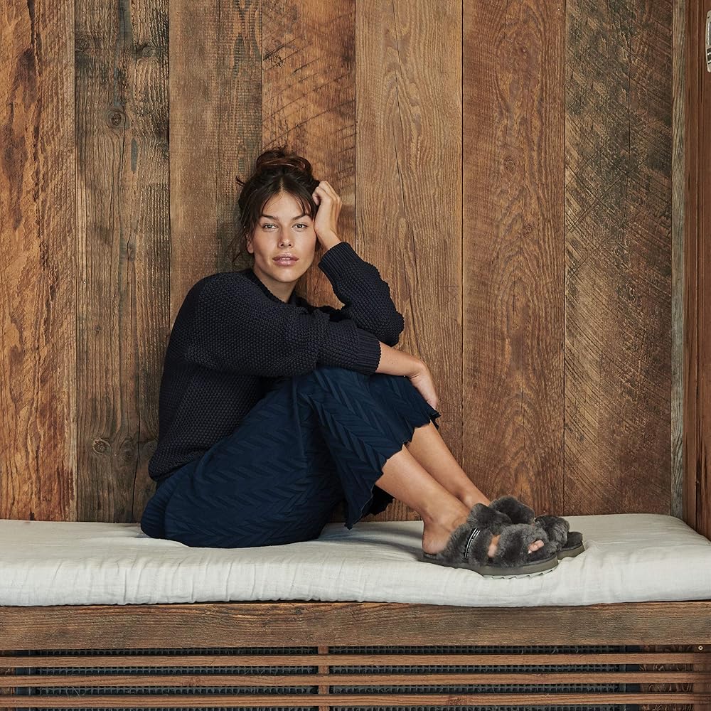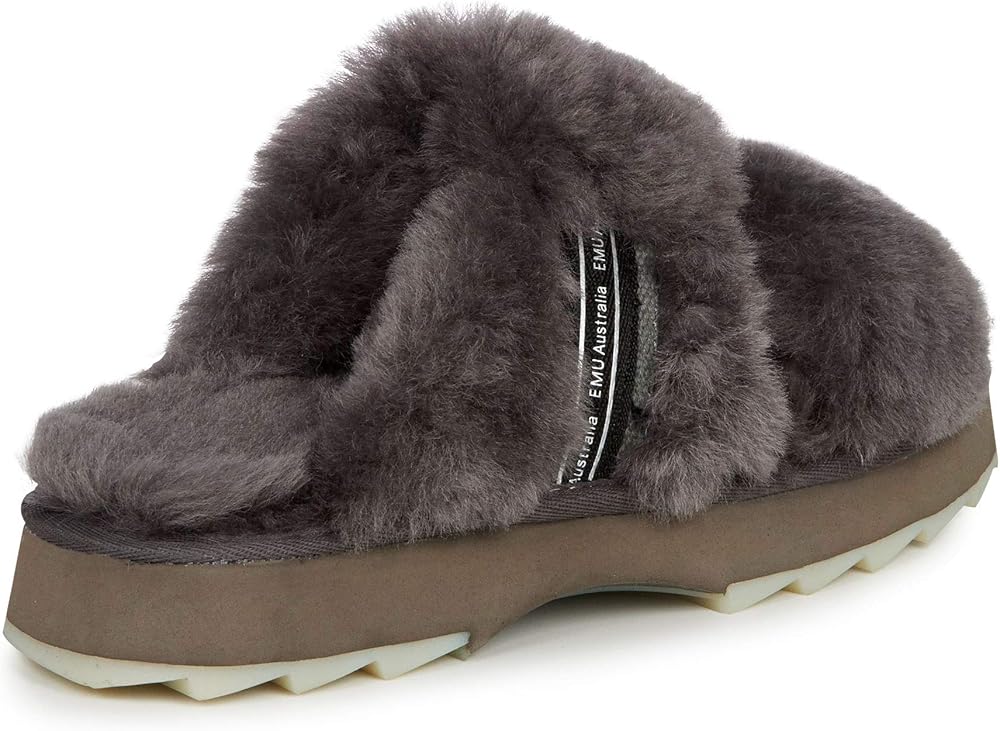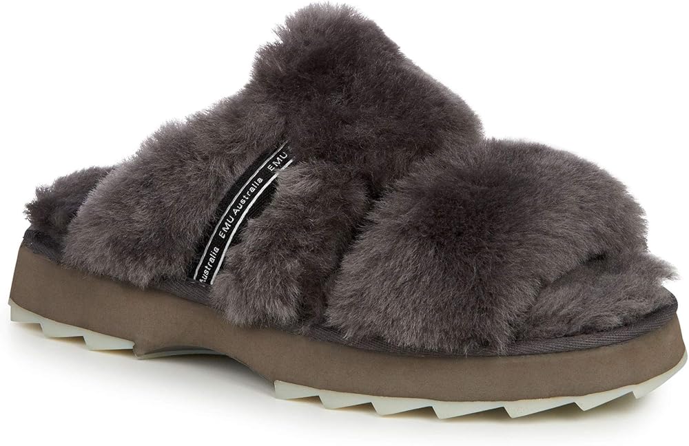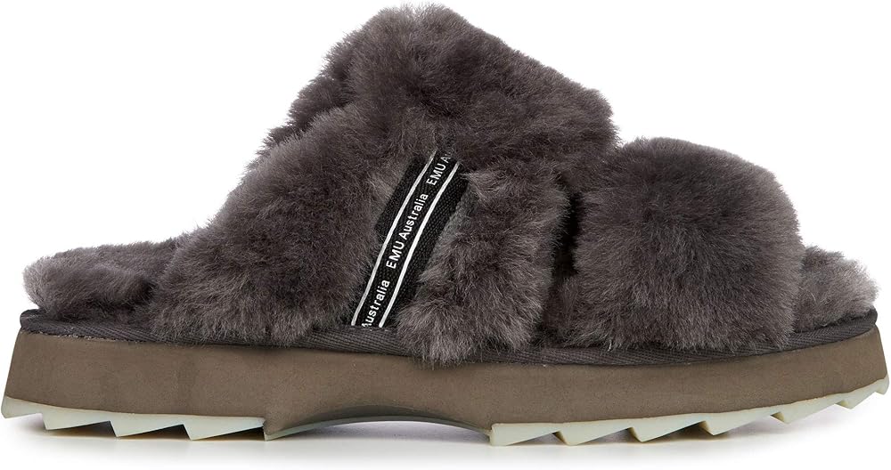 Fashionable and comfy, the EMU Australia Wobbegong slides keep you warm and cozy. Sheepskin fur upper, lining, and insole. Slide-on style. Open round toe. Elevated flat silhouette. Rubber light EPR midsole. Foam inserts. Serrated rubber outsole. The slippers contain real dyed fur of sheep from Australia.