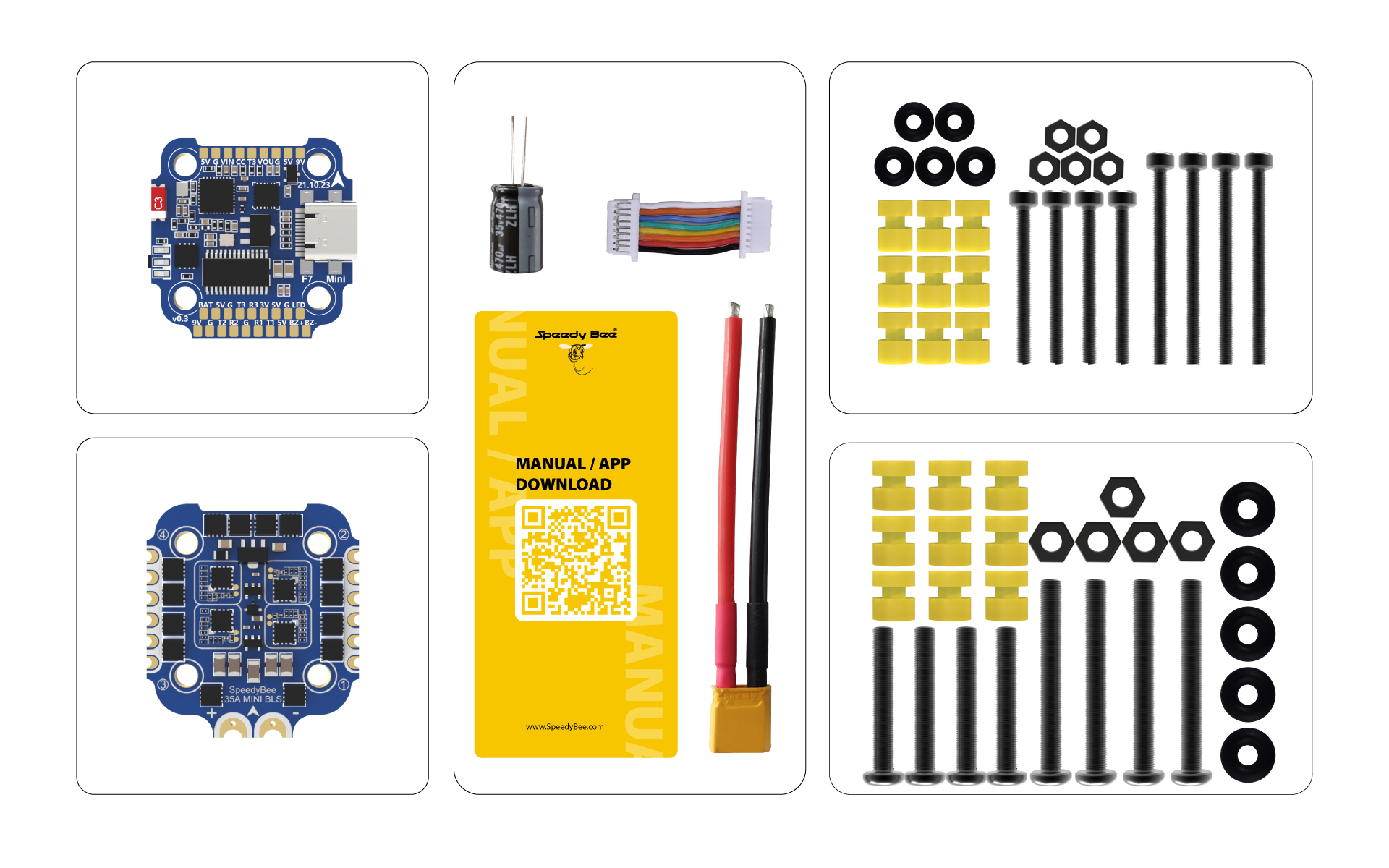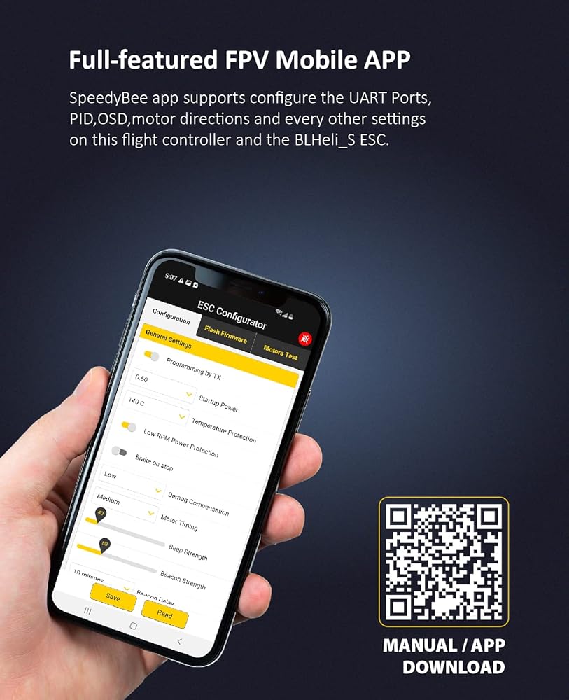 ميزة SpeedyBee: قم بتنزيل تطبيق SpeedyBee على أجهزتك المحمولة، ويمكنك تغيير إعدادات وحدة التحكم في الطيران وESC مجانًا في أي مكان بدون جهاز كمبيوتر.
