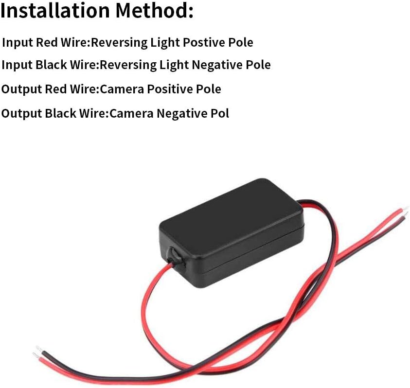 【Easy to Use】-- Easy to install, no any modification required. Just read the wire setup-- Input Red Wire: Reversing Light Positive Pole/ Input Black Wire: Reversing Light Negative Pole /Output Red Wire: Camera Positive Pole /Output Black Wire: Camera Negative Pole