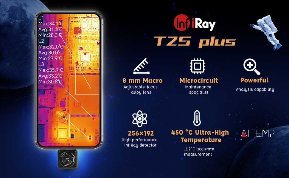 عدسة ماكرو قابلة للتركيز مقاس 8 مم: إن InfiRay T2S Plus عبارة عن جهاز تصوير حراري للهواتف الذكية يستخدم الأشعة تحت الحمراء لإنشاء صور لأشياء غير مرئية بالعين المجردة. يحتوي جهاز التصوير على 8 أمتار مدمجة