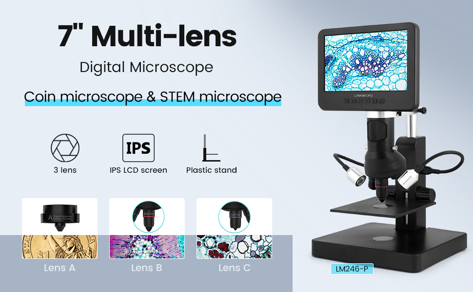 【3 عدسات في 1 للاستخدامات المتعددة】 LINKMICRO LM246 هو مجهر متعدد الاستخدامات فريد من نوعه مع عدسة رقمية واحدة وعدستين بيولوجيتين. يمكن تبديل مجهر العملة ومجهر العلوم STEM حسب الرغبة، مع تلبية الاحتياجات المختلفة للبالغين والطلاب.