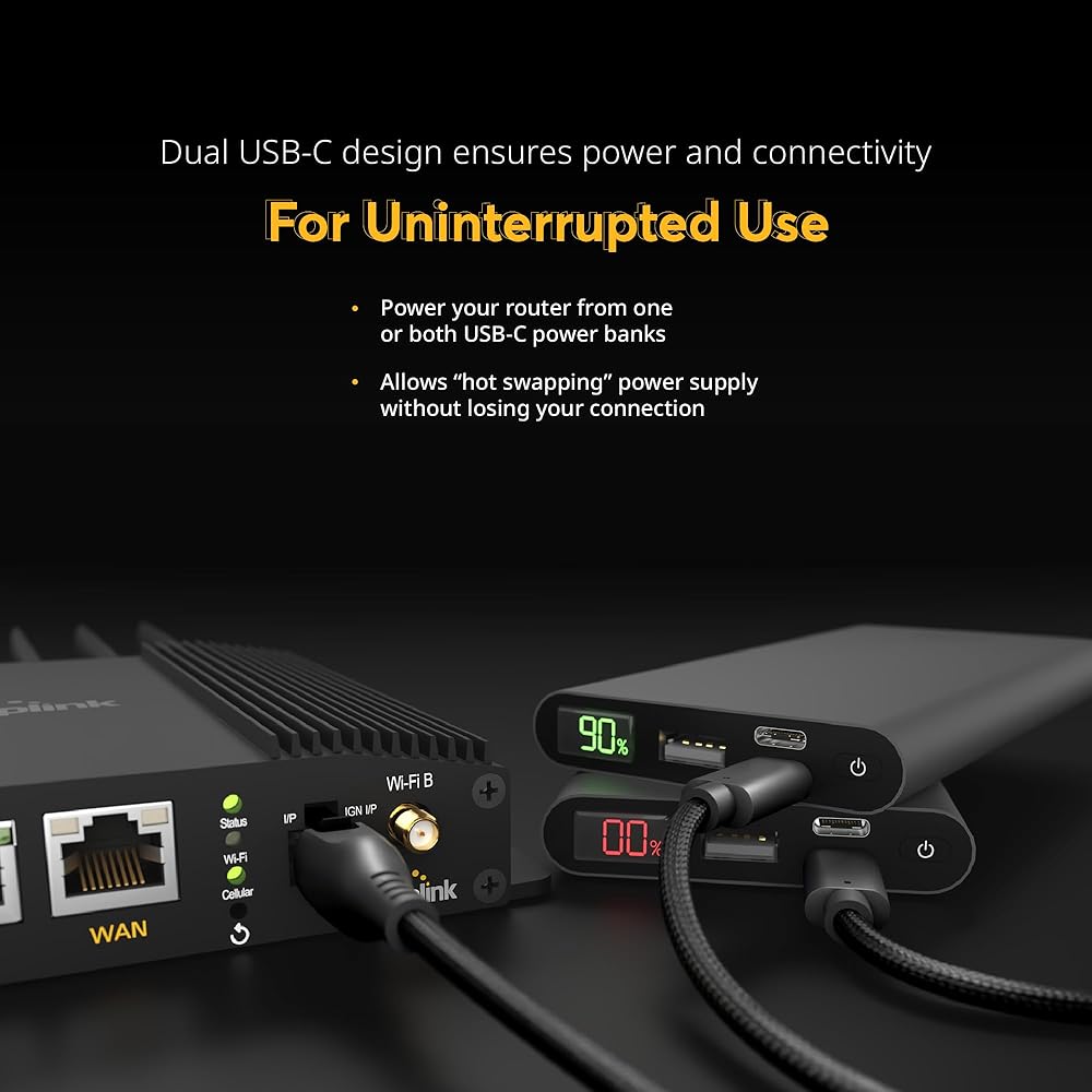 Innovative Dual USB-C Design: Our Peplink power cable features a unique dual USB-C connector, ensuring your router always receives power without interruptions, even when "hot swapping" between power banks.