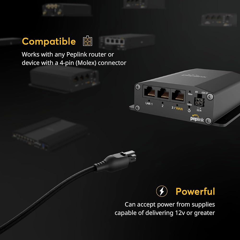 Compatibility and Convenience: Designed to connect to any Peplink router with a 4-pin (Molex) input, our cable facilitates an easy and effective power connection, supporting optimal performance with a recommended 15V power source.