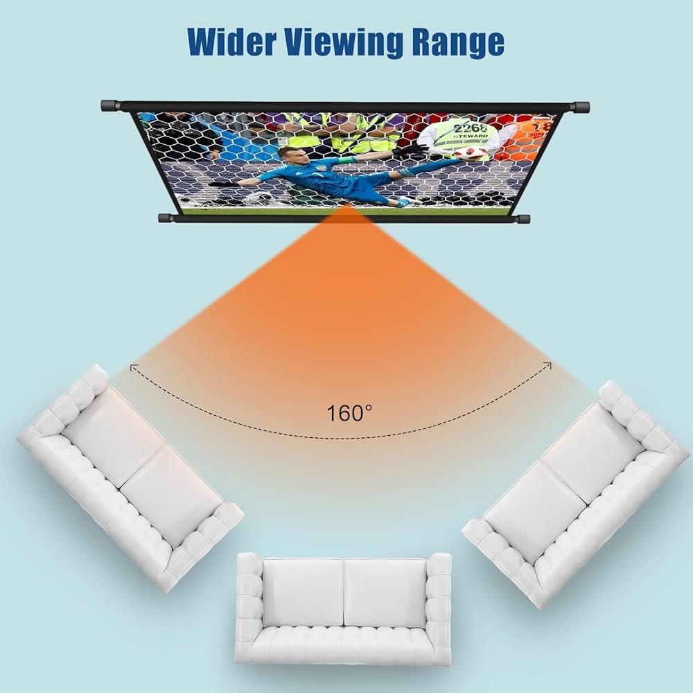 تنسيق 16:9 وزاوية عرض واسعة: شاشة عرض 100 بوصة بتنسيق 16:9 وزاوية عرض أوسع 160 درجة، مناسبة لمعظم أجهزة العرض المنزلية، يمكنك تجربة ليلة الفيلم من أوضاع عرض مختلفة. علاوة على ذلك، تدعم شاشات العرض العرض الأمامي والخلفي. شاشة العرض مقاس 100 بوصة مناسبة لعرض الأفلام ومقاطع الفيديو.