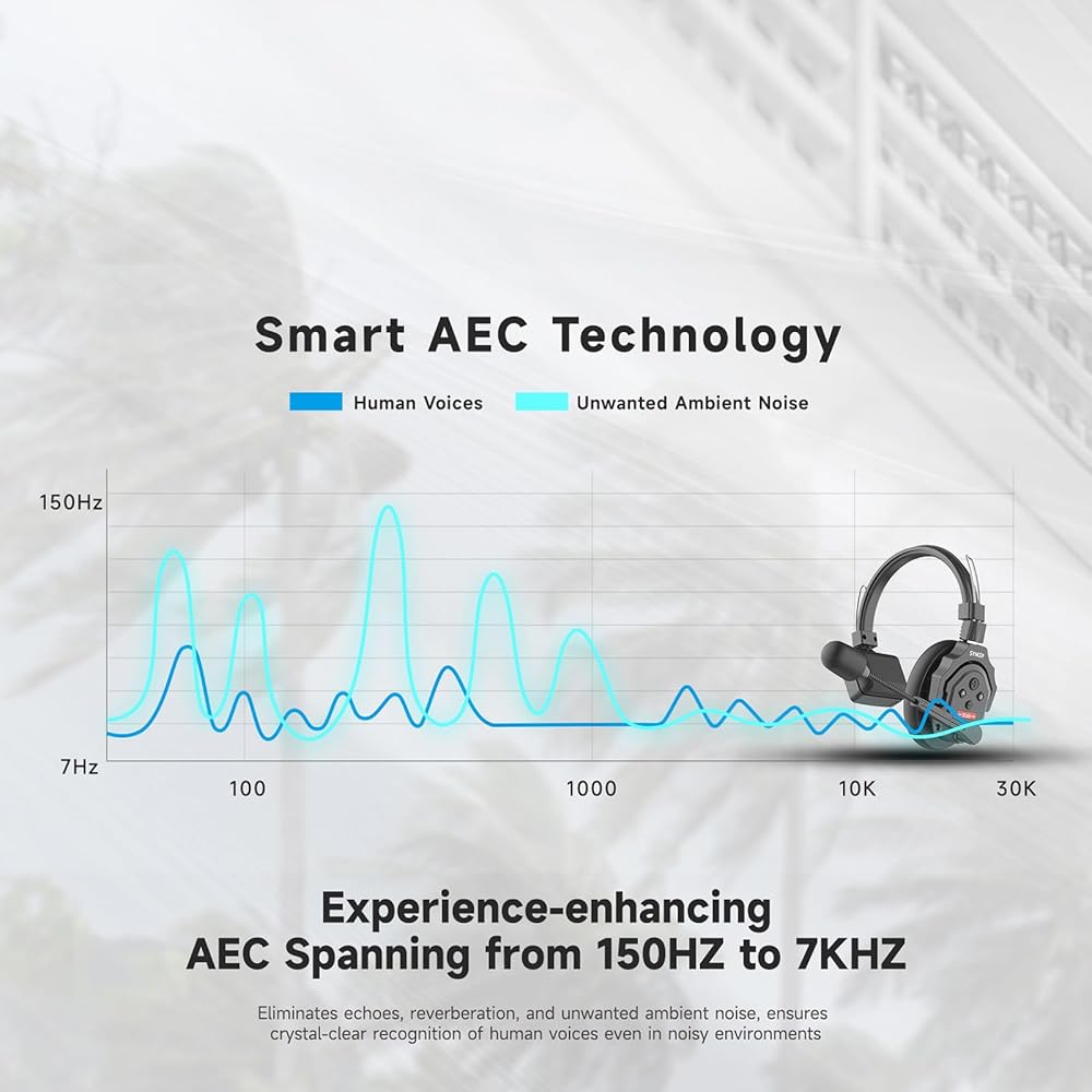 【AEC Technology Noise Cancellation】Equipped with advanced AEC technology, the wireless headset with mic eliminates echoes, reverberation, and unwanted ambient noise, ensuring crystal-clear recognition of human voices even in noisy environments. One-Button Clarity design that allows you to activate the noise cancellation feature at the press of a button.