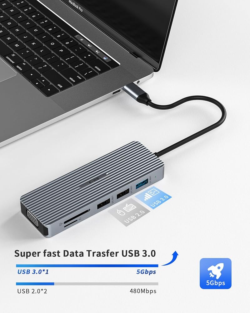 【Advanced Triple Display Capability】Elevate your workspace with a triple monitor setup using the VGA port and 2 HDMI ports on this USB C Hub. Supporting 19201080 @60Hz VGA and 38402160@30Hz double HDMI, it seamlessly extends or mirrors your laptop screen to monitors, projectors, HDTVs, delivering a vivid 3D effect video sync. Note: Triple display is supported on Windows systems, while MAC OS supports dual display.