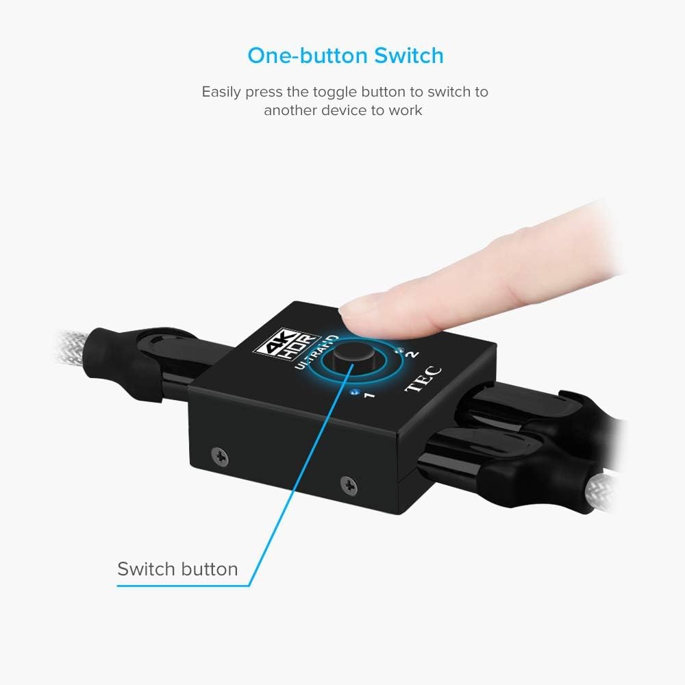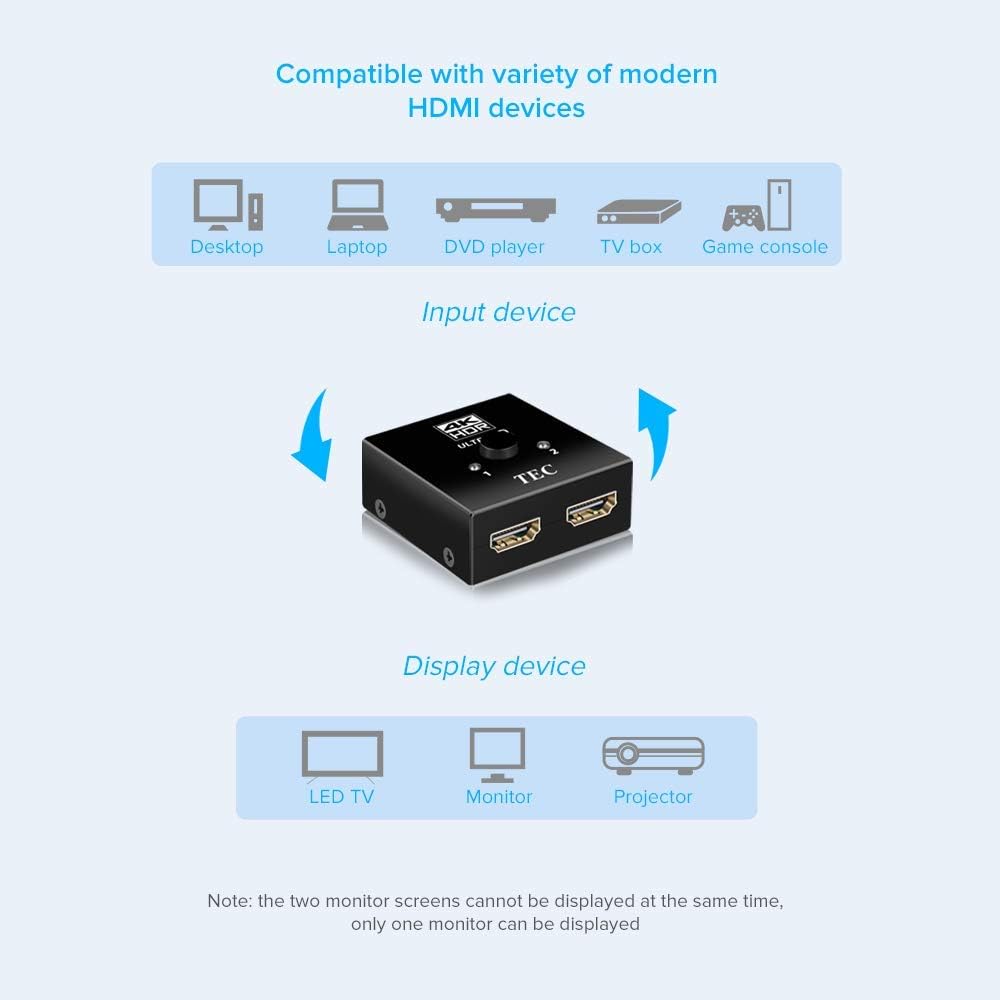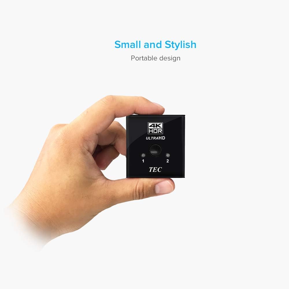 BI-DIRECTIONAL HDMI SWITCHER DEVICE - TEC HDMI Switch offers an easy solution for you to connect two devices such as PS4, XBOX, PC, TV Stick with your single port HDTV for video output, easily switch between two HDMI sources. HDMI Splitter Mode allows you to connect one HDMI source to two displays, only 1 of the 2 displays works at a time.