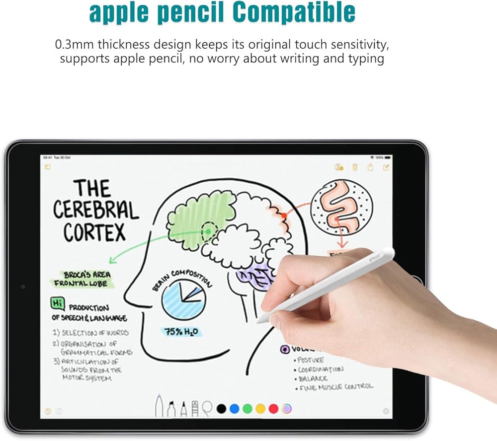 • 4. SUPPORT APPLE PENCIL: 0.3mm thickness screen protector keeps its original touch sensitivity, supports Apple pencil, no worry about writing and typing