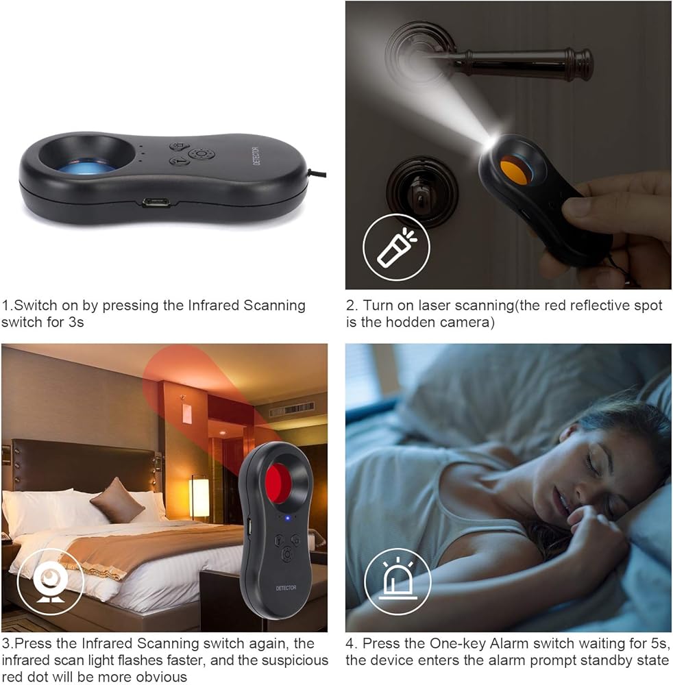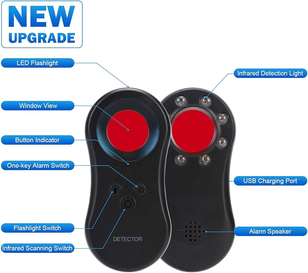أفضل مكتشف لكاميرات التجسس: يمكنك استخدام كاشف الكاميرا الخفية لتحديد موقع أي عدسة كاميرا تجسس بسرعة وعلى الفور. قد تكون هذه الكاميرات مخفية في التلفزيون، والساعات المثبتة على الحائط، وكاشفات الدخان، والمرايا، ومصابيح الإضاءة، ومكبرات الصوت، وما إلى ذلك، حيث لا يمكنك ذلك يراهم.