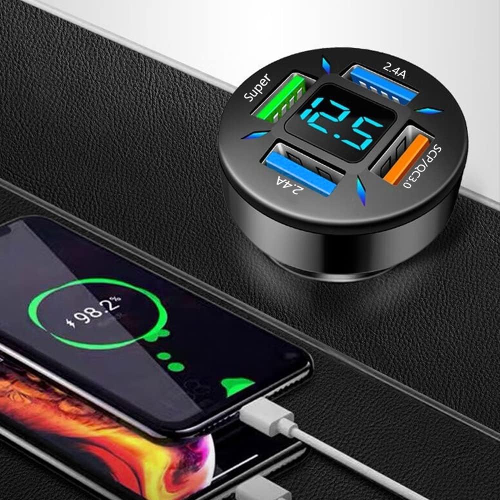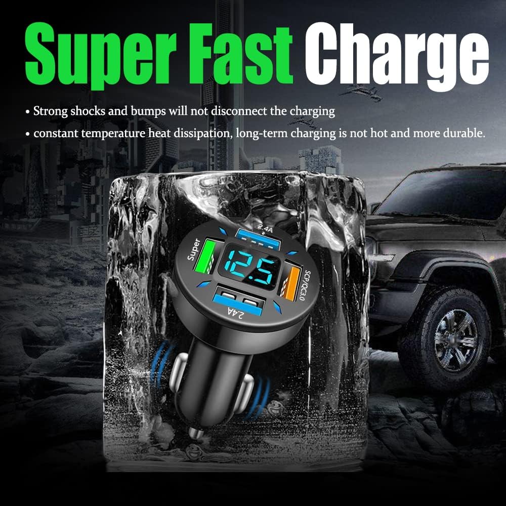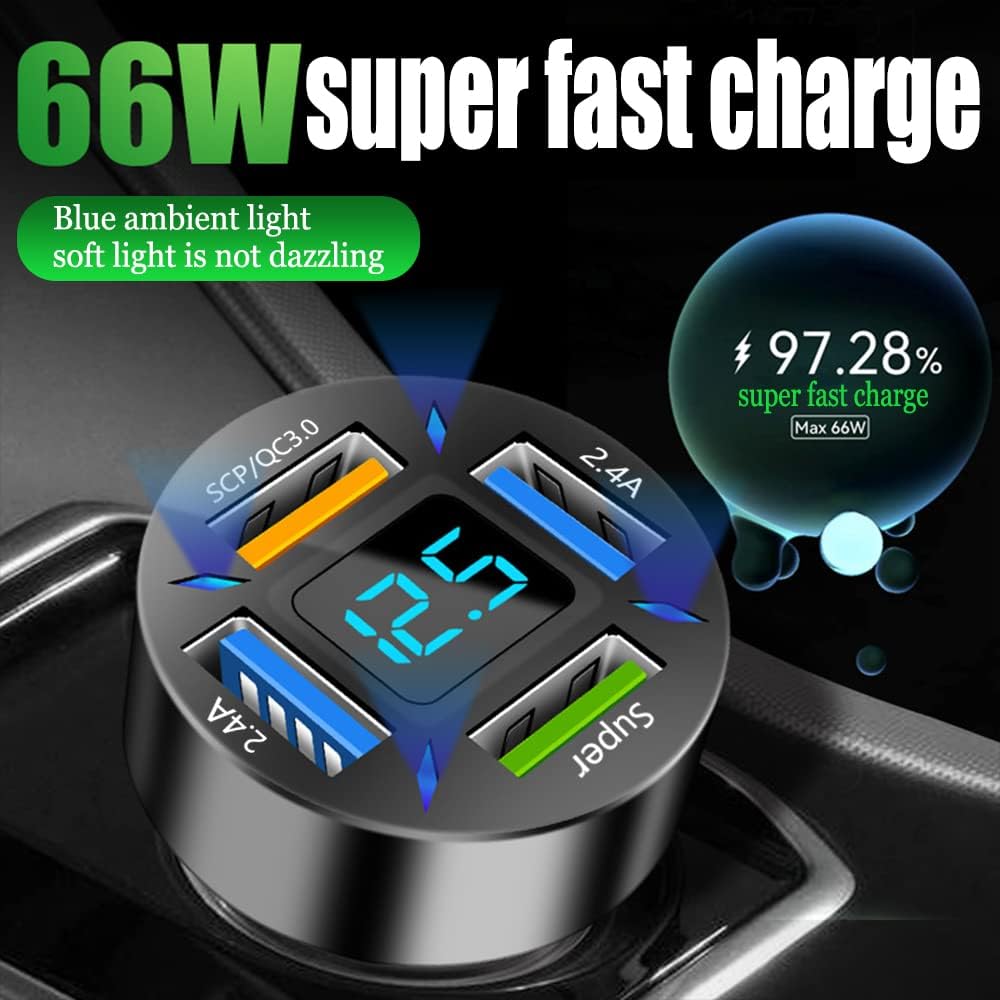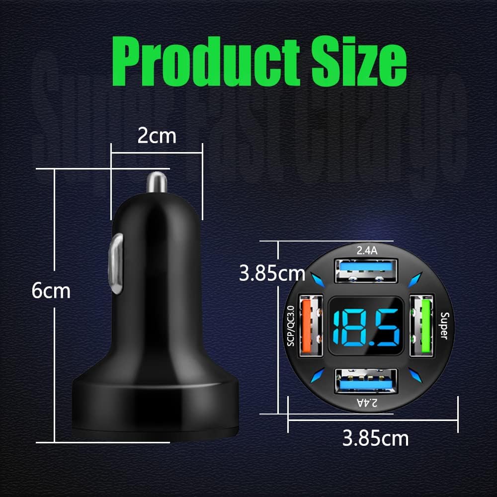 [High quality materials]: The 4-port USB fast car charger with digital display is made of aluminum alloy materials and streamlined shell design. The high-performance main control chip is protected by five layers of circuit, which is safer to use. The built-in management chip can intelligently split and quickly charge without hurting the machine.