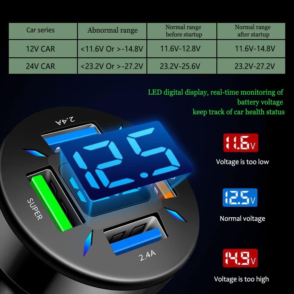 [Upgrade digital display car charging]: LED digital display, real-time monitoring of battery voltage, and grasp the health status of the car at any time. To prevent your phone from being overcharged or charged to the wrong voltage, which may cause damage, the LED light screen can display the voltage of the car battery at any time to ensure safer charging.