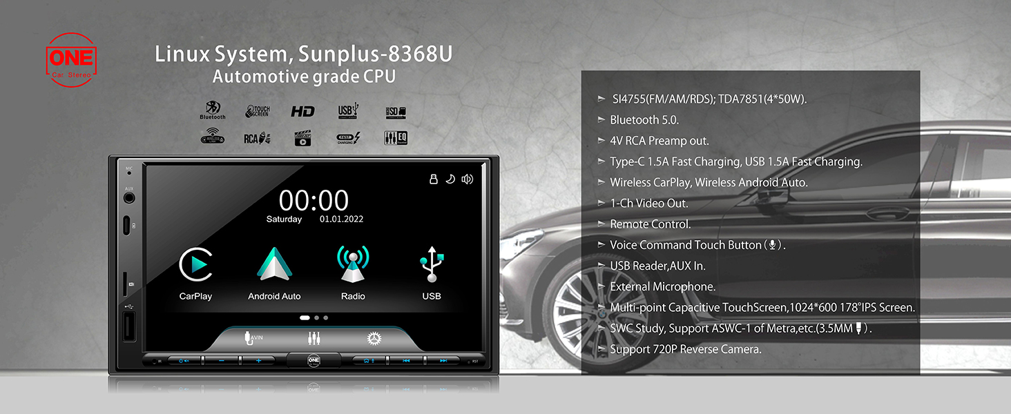 درجة السيارة مع 1.5 أمبير QC: ستيريو سيارة Linux مصمم بشريحة رئيسية من فئة المركبات Sunplus-8368U وراديو SI4755 عالي الأداء (FM/AM/RDS)، وحدة بلوتوث 5.0 مستقلة، وفريدة من نوعها مجهزة بواجهة من النوع C وUSB لـ القيمة العددية الحقيقية 1.5A شحن سريع.