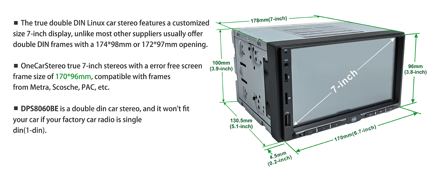 هيكل مخصص: شاشة عرض HD IPS كاملة الزاوية (178 درجة) حصرية ومخصصة خصيصًا، حجم لوحة خالية من الأخطاء 170 * 96 مم، شاشة ستيريو سيارة تعمل باللمس متعددة النقاط 2-DIN حقيقية مع دعامة أجهزة احتياطية مضادة للسرقة. متوافق مع الإطارات من Metra وScosche وPAC وما إلى ذلك.