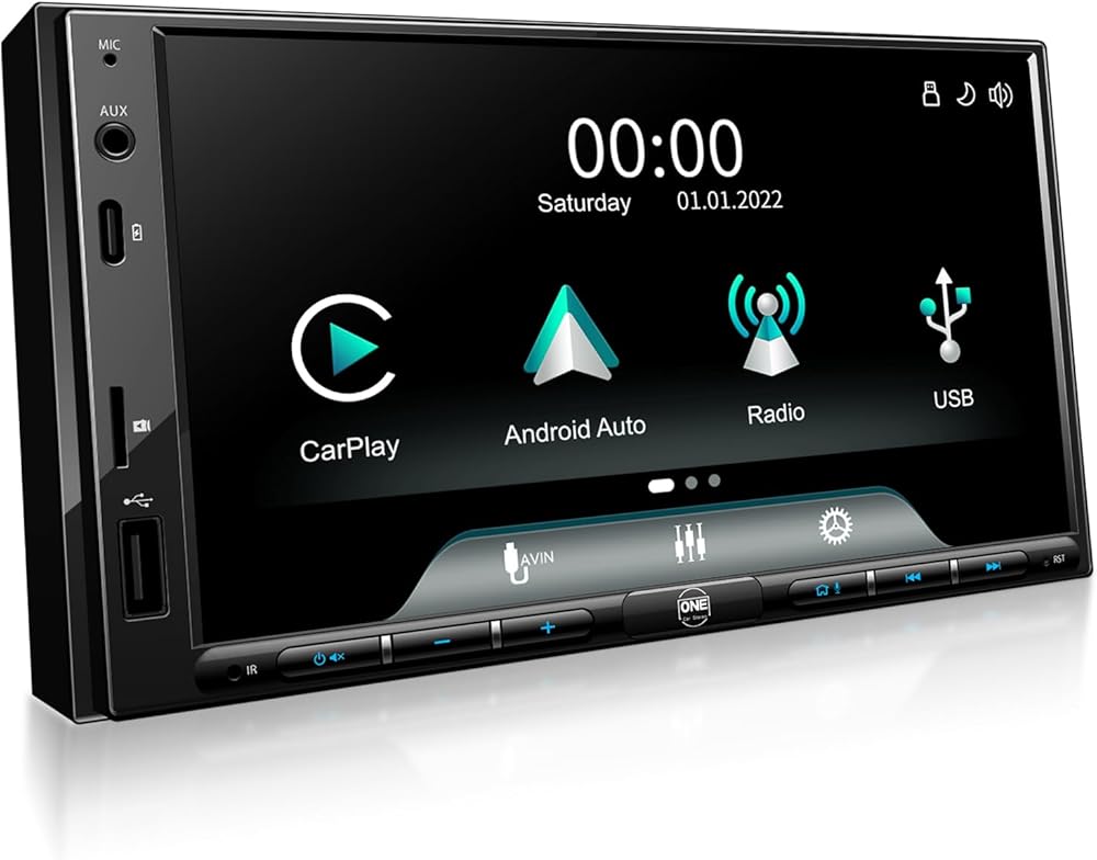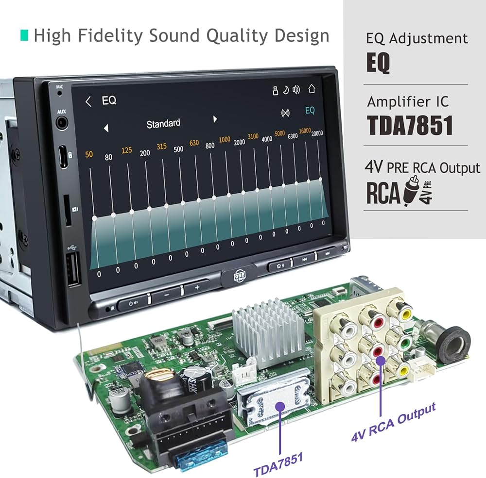 OneCarStereo Linux Double-DIN سيارة ستيريو تعمل باللمس، CarPlay Android Auto، مدمج TDA7851 مع مخرج Preamp 4V، ملاحة 7 بوصة داخل لوحة القيادة مع راديو FM AM RDS، نوع C وUSB 1.5A شحن سريع