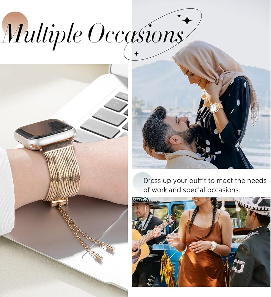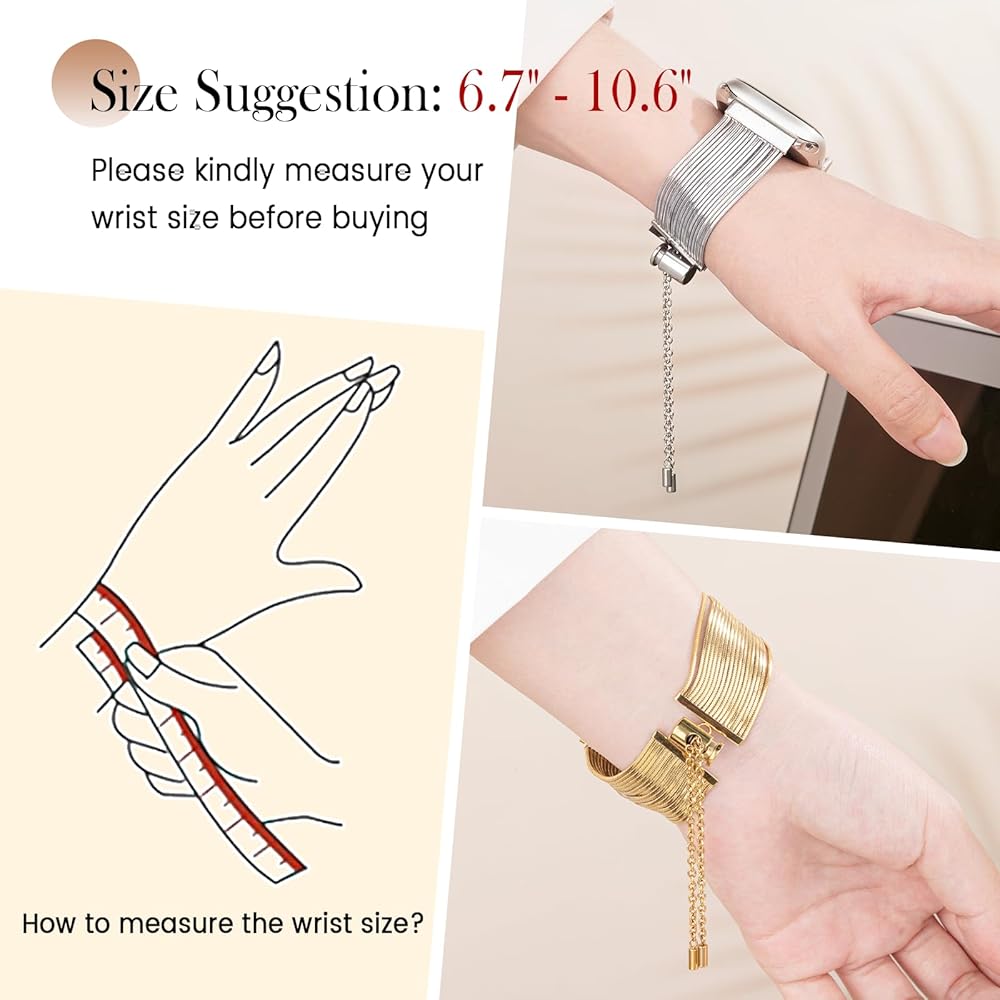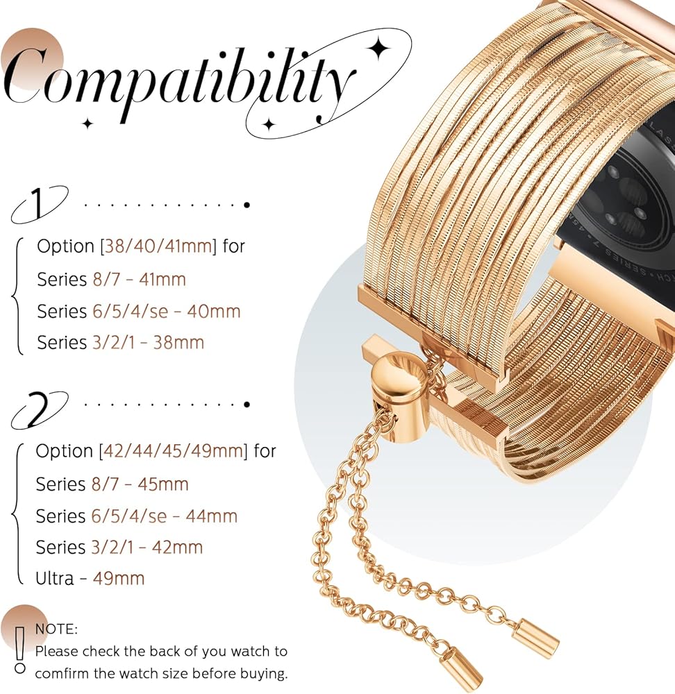 التوافق: هذه الأساور النسائية مناسبة لسلسلة ساعات Apple 7 / 8 / 9 41 ملم، SE / SE (الجيل الثاني) / السلسلة 6 / 5 / 4 40 ملم، السلسلة 3 / 2 / 1 38 ملم. يرجى التحقق من الجزء الخلفي من ساعتك والتأكد من طلب المقاس الصحيح.