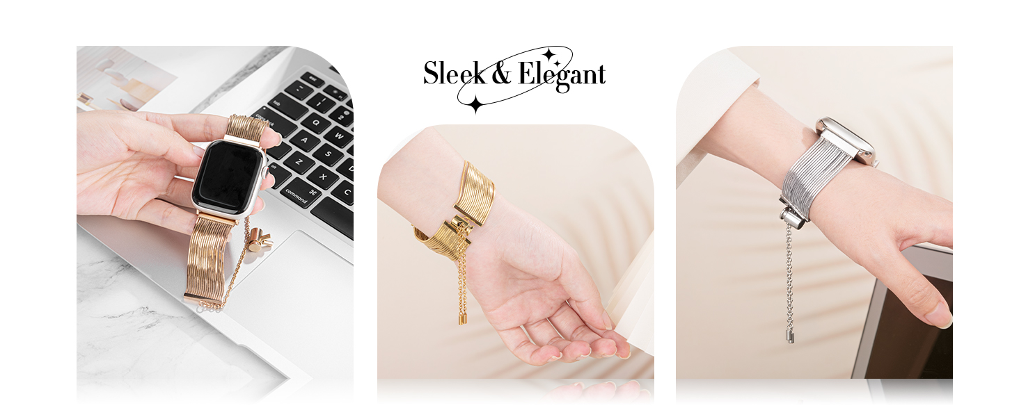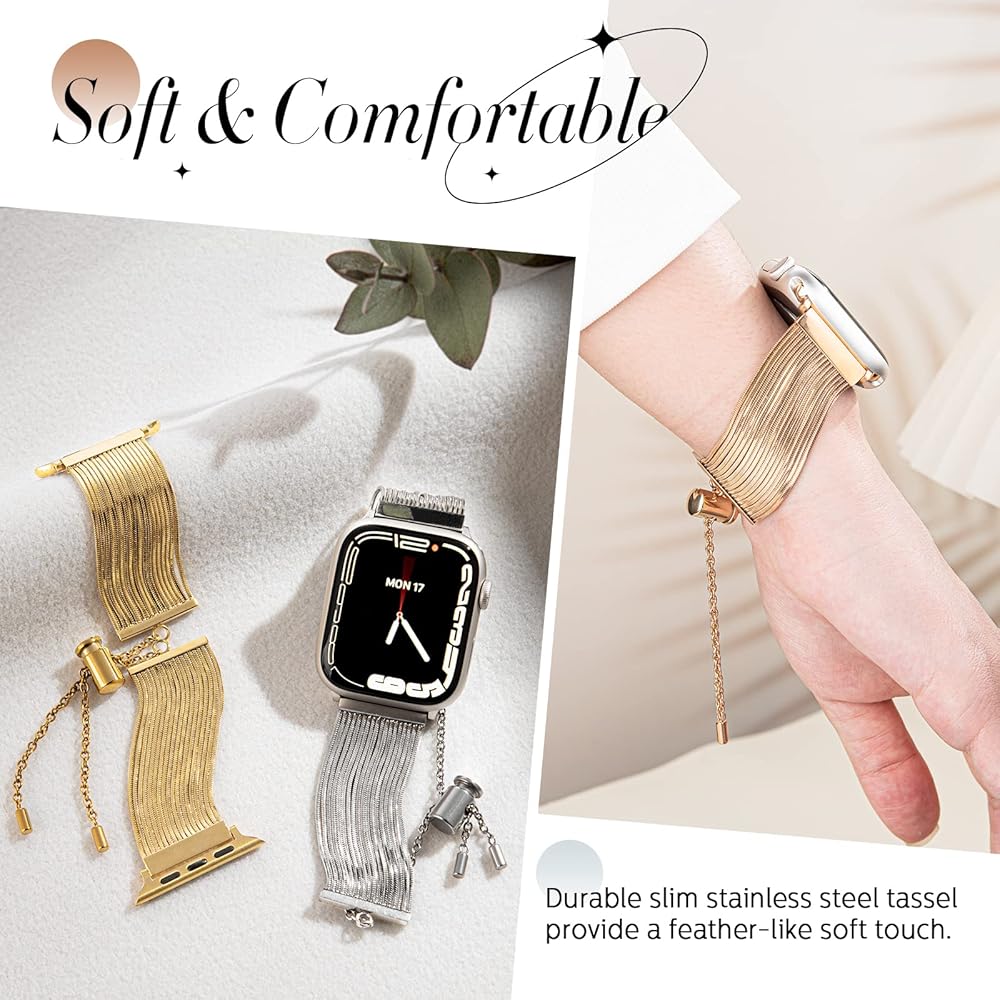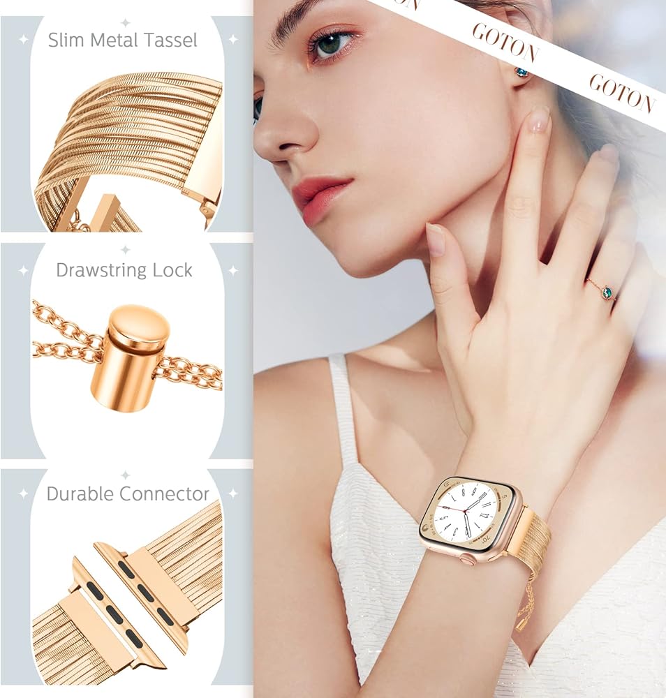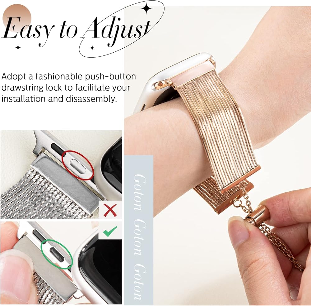 التوافق: هذه الأساور النسائية مناسبة لسلسلة ساعات Apple 7 / 8 / 9 41 ملم، SE / SE (الجيل الثاني) / السلسلة 6 / 5 / 4 40 ملم، السلسلة 3 / 2 / 1 38 ملم. يرجى التحقق من الجزء الخلفي من ساعتك والتأكد من طلب المقاس الصحيح.