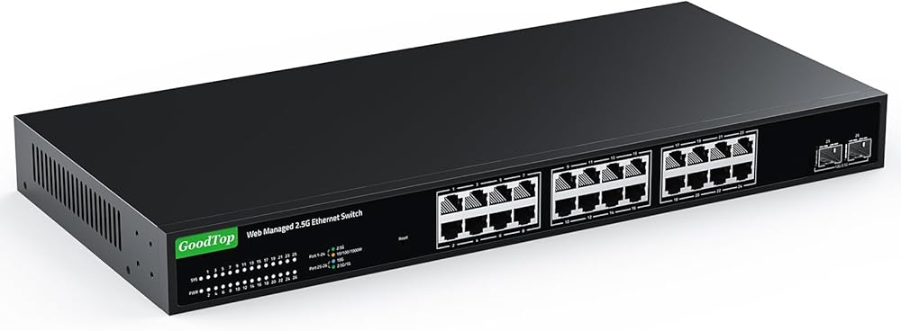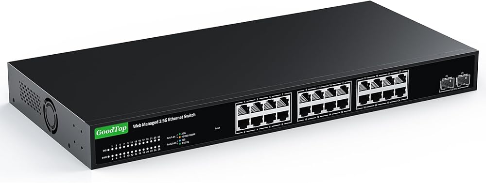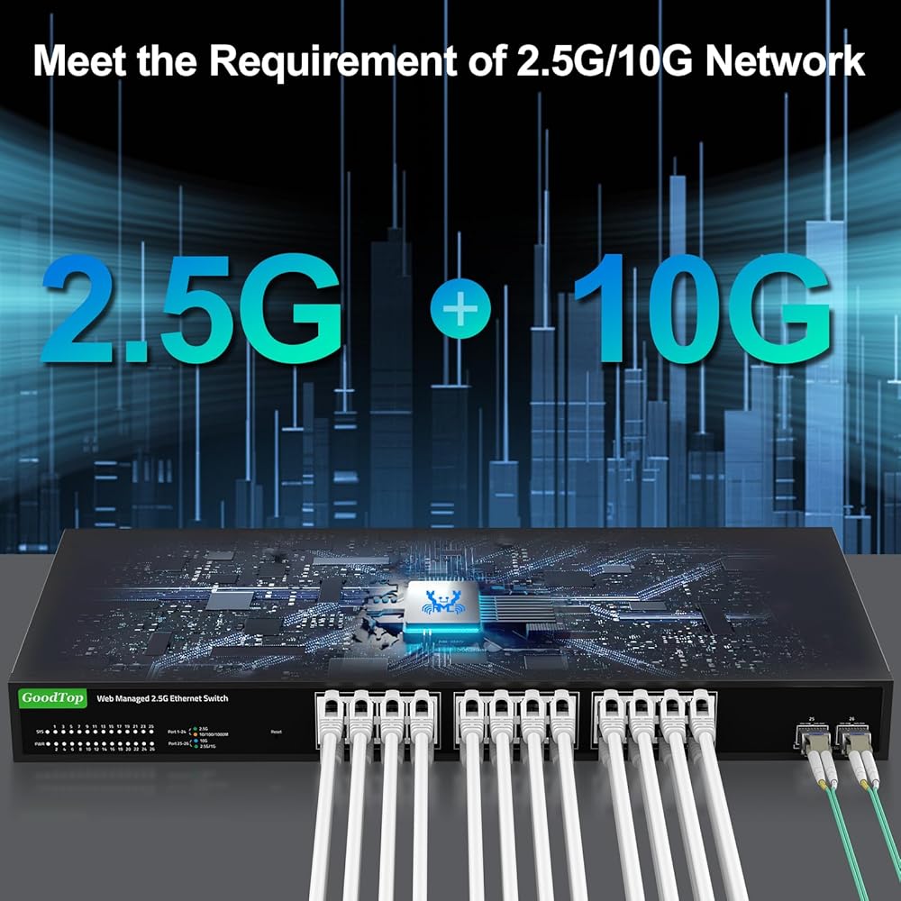 ►【مفتاح 2.5 جيجا بايت و10 جيجا بايت】المحول مجهز بمنفذ إيثرنت 24 × 2.5 جيجا بايت وفتحتين SFP+ 2 × 10 جيجا بايت. تدعم منافذ 2.5G RJ45 سرعة التكيف 10/100/1000M/2.5G وMDI/MDIX التلقائي. تدعم فتحات 10G SFP+ سرعة 10M/100M/1G/2.5G/10G، ومتوافقة مع وحدات النحاس RJ45 ووحدات الألياف الضوئية وكابلات DAC وAOC. (ملاحظة: لا تدعم وحدات GPON/XGSPON مع بروتوكول خاص).