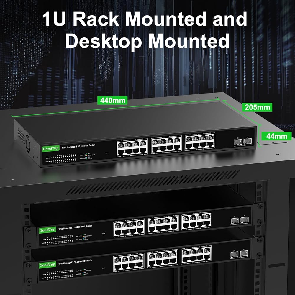 ►[غلاف معدني وتصميم بدون مروحة] مع تصميم بدون مروحة وغلاف معدني، يمكن للمفتاح أن يعمل بصمت ويبدد الحرارة من خلال الفتحات والغطاء المعدني. يلعب الدعم وسطح المكتب والمثبت على حامل 1U دورًا مهمًا في أجهزة متعددة وشبكات متعددة الطبقات لغرفة الخادم أو مركز البيانات.