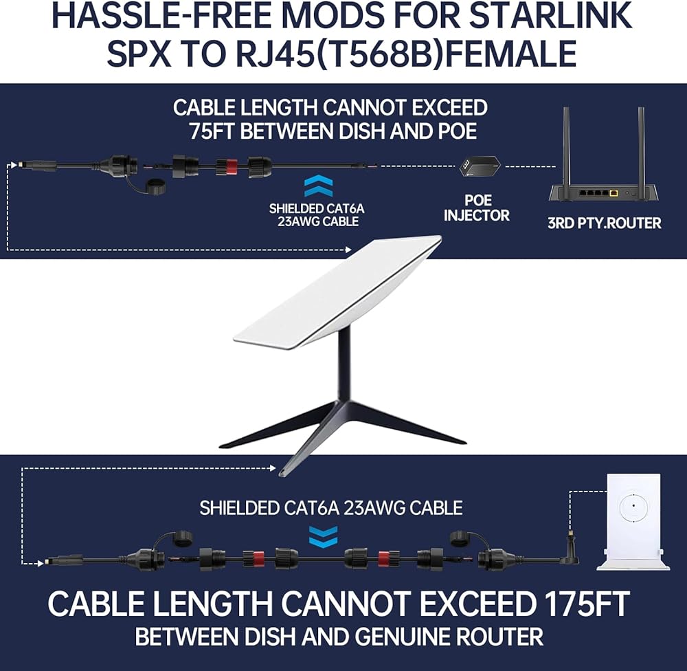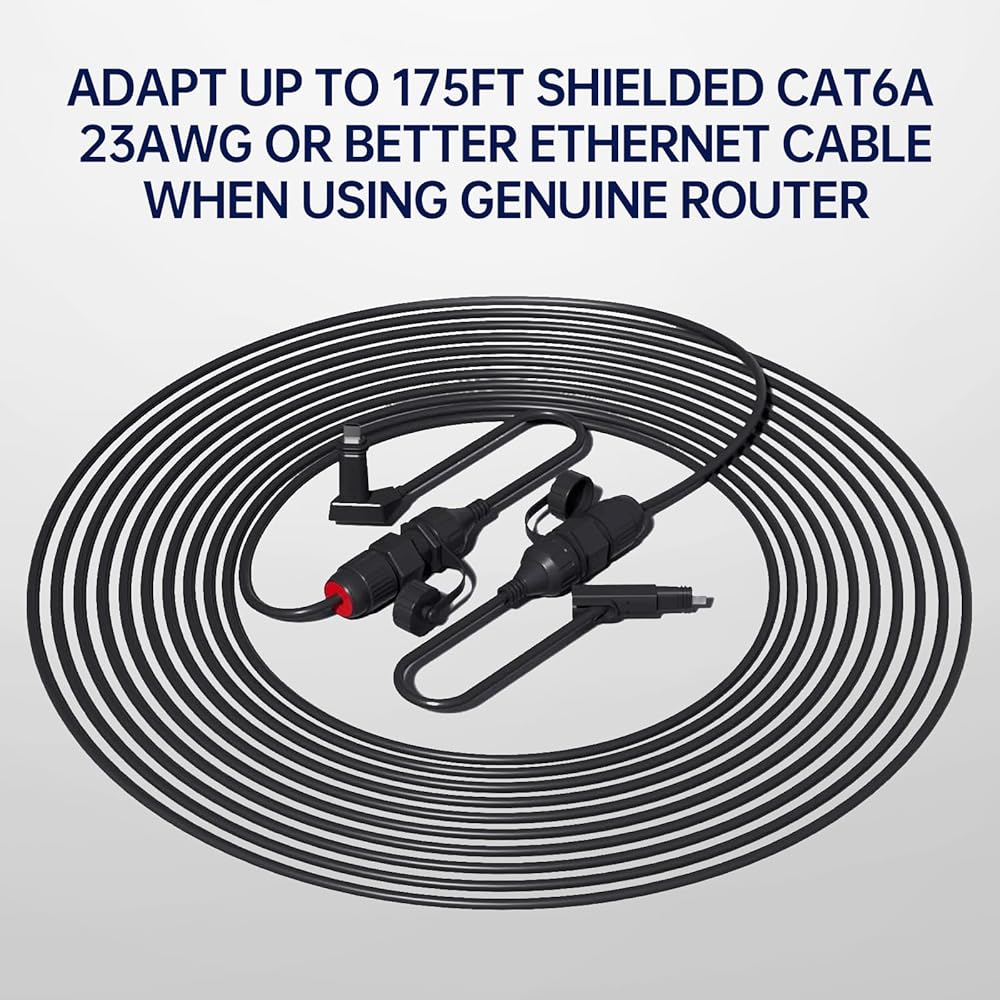 [نصائح تثبيت مهمة] قد تؤدي المقاومة المفرطة إلى تشغيل Starlink بشكل غير طبيعي. نوصي باستخدام كابل Cat6 واحد أو كابل إيثرنت أعلى بدون وصلات/موسعات، والتأكد من أن الطول لا يتجاوز 175 قدمًا عند استخدامه مع جهاز توجيه Gen 2 أصلي. بالنسبة لكابلات إيثرنت المجعدة محلية الصنع، تأكد من وجود اتصال قوي بين أطراف RJ45. قم بتركيب المقبس المقاوم للماء بشكل صحيح دون التواء أو تمزيق أطراف الكابل.