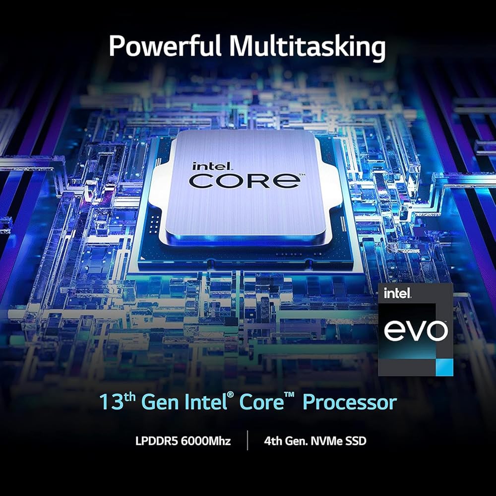 LG gram laptop powered by the new 12Core i7-1360P Processor; Enjoy instant responsiveness, smoother gaming experiences and efficient multitasking capabilities.