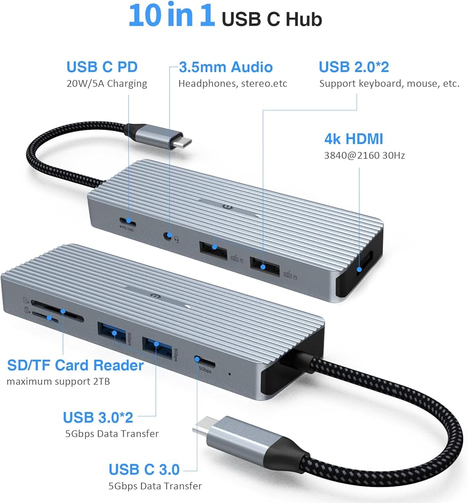 Comprehensive 10-Port Connectivity for All Your Needs: This versatile USB C hub features 10 essential ports including 1 HDMI for 4K displays, 2 USB 3.0 Type-A for blazing fast transfers, 1 USB-C data transfer, 2 USB 2.0 Type-A for peripherals, SD/TF readers for media, 1 USB-C Power Delivery, and a 3.5mm audio jack. With so many options, it meets virtually every connectivity need for work and entertainment.