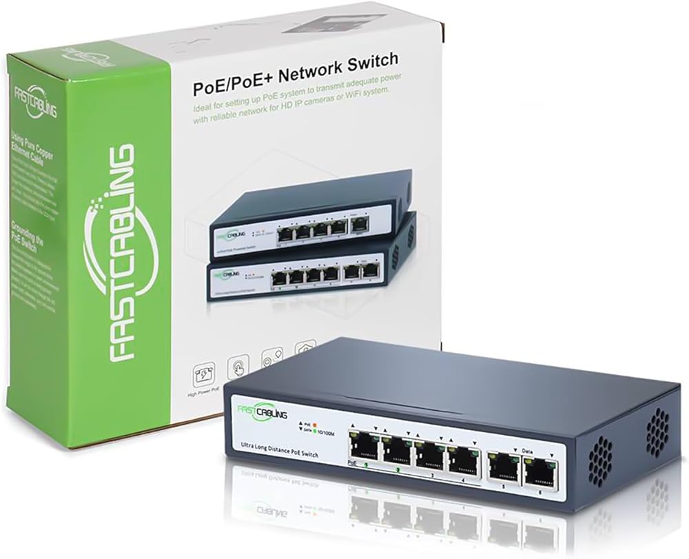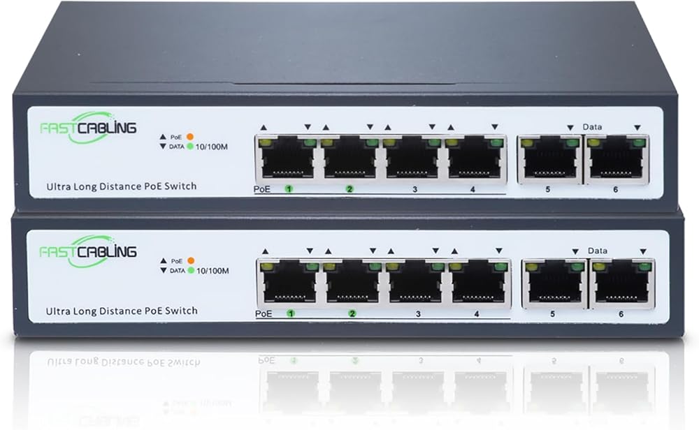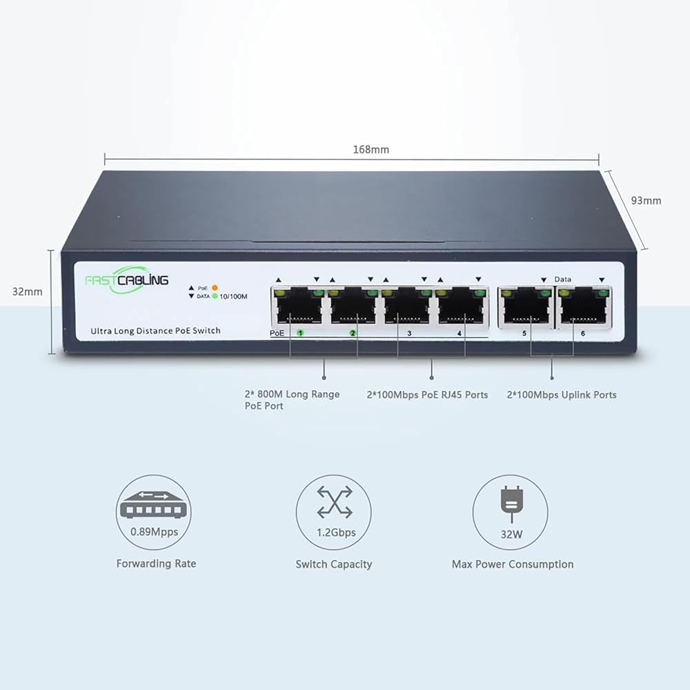 • Fast Speed: Four 10/100Mbps RJ45 PoE ports and two 10/100Mbps Ethernet uplink ports, high-speed connectivity between two switches at a data rate of 100Mbps.
