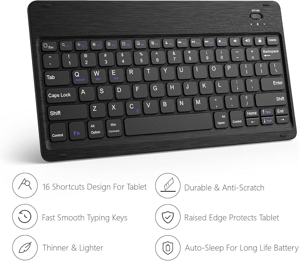 • [وظيفة النوم / الاستيقاظ التلقائي] تأتي لوحة المفاتيح مع وظيفة النوم التلقائي. ستدخل لوحة المفاتيح تلقائيًا في حالة السكون إذا لم يتم استخدامها لفترة طويلة. انقر فوق أي زر وانتظر لمدة 2 إلى 3 ثوانٍ، وستتصل لوحة المفاتيح تلقائيًا بجهاز Tab S7 Plus مرة أخرى. لا يمكنها تقليل الشحن اليومي فحسب، بل تعمل أيضًا على تحسين عمر بطارية لوحة المفاتيح.