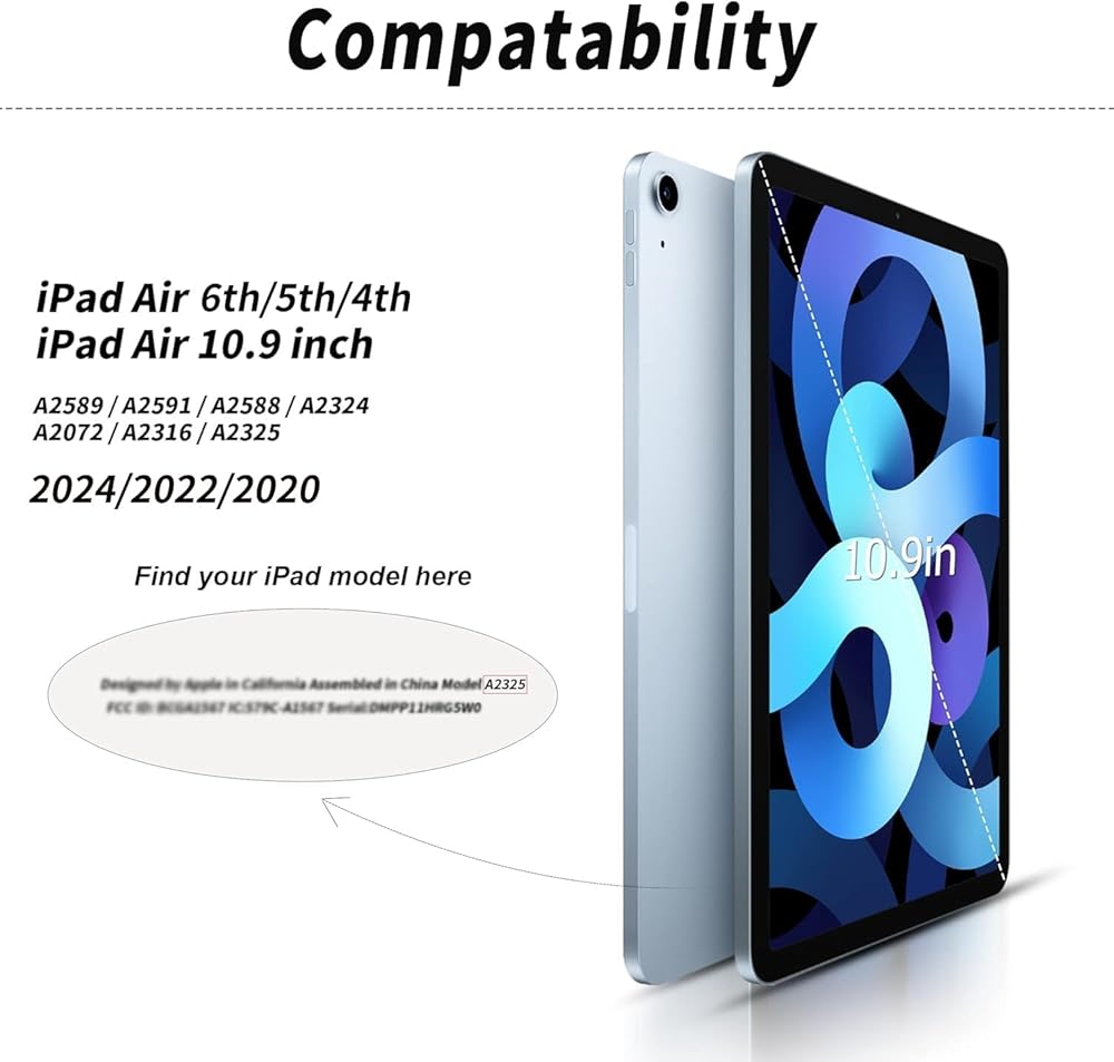 👝【نموذج التوافق】غطاء Kenke iPad air مصمم لجهاز iPad Air الجيل السادس 2024 و10.9 بوصة iPad Air الجيل الخامس 2022 (A2589/A2591/A2588) وiPad Air الجيل الرابع 2020 (A2324/A2072/A2316/A2325). غير متوافق مع أي موديلات iPad أخرى. يرجى التحقق من الجزء الخلفي لجهاز iPad الخاص بك للعثور على رقم الطراز قبل تقديم الطلب.
