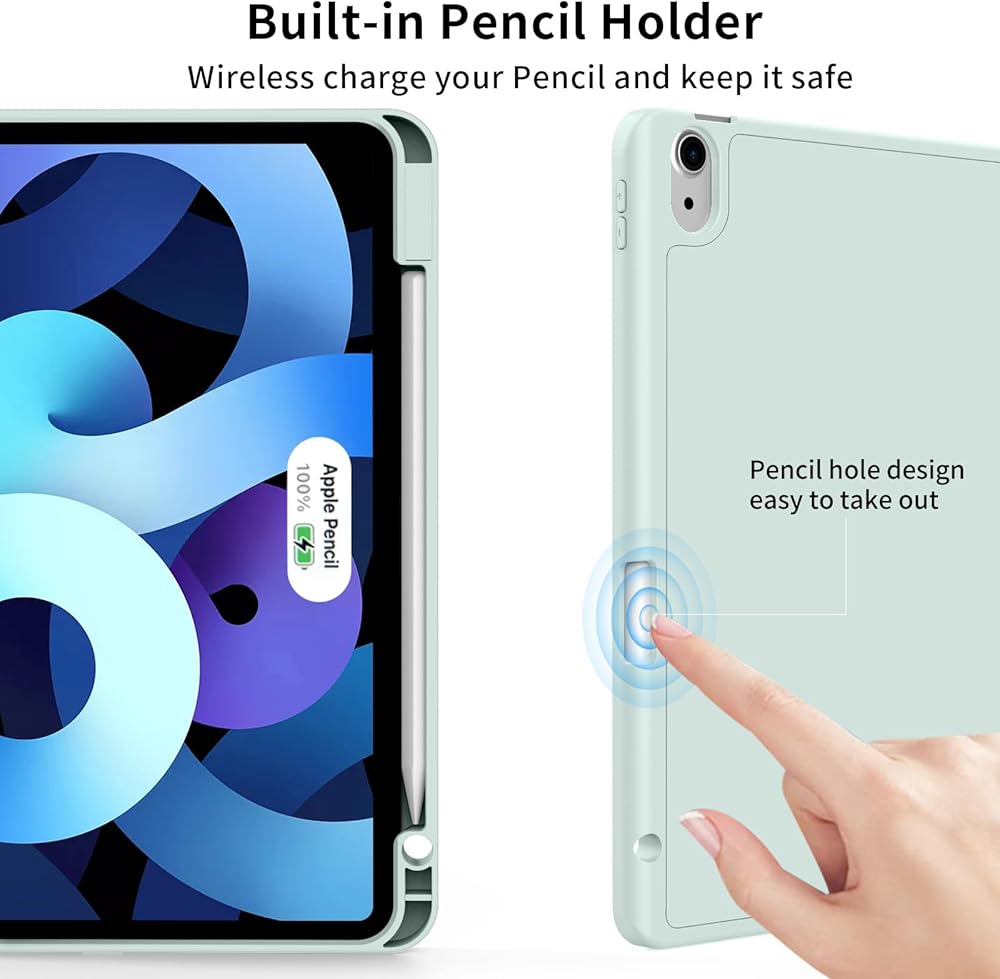 👝【حامل قلم رصاص مدمج】تحتوي حافظة iPad Air 5 على حامل قلم رصاص مدمج من Apple. عند عدم استخدامه، يمكنك وضع القلم الرصاص في موضع مشبك القلم الرصاص للشحن، وتجنب فقدان القلم أو كسره عند المشي أو في الهواء الطلق. (ملاحظة: القلم الرصاص غير متضمن)