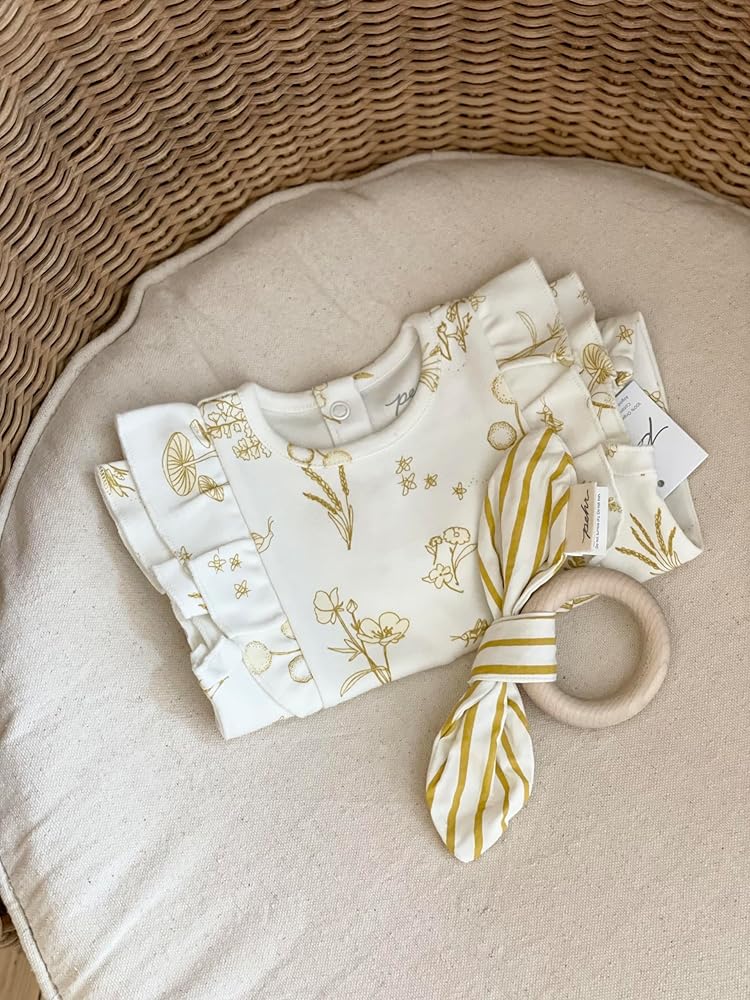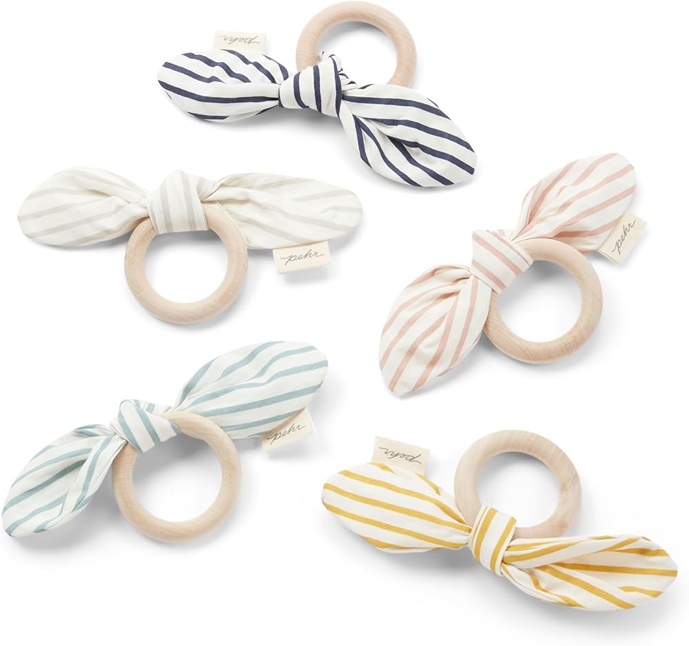 The On The Go Teether is designed to make travel with kids a little easier. This Teether is made from Sustainable FSC Maple Wood. Baby can drool, slobber and chew on the teether without worry. Just wash with warm soapy water when needed! The organic cotton bow includes a crinkly interior for added stimulation and can be taken off and thrown in the wash. Easy peasy!