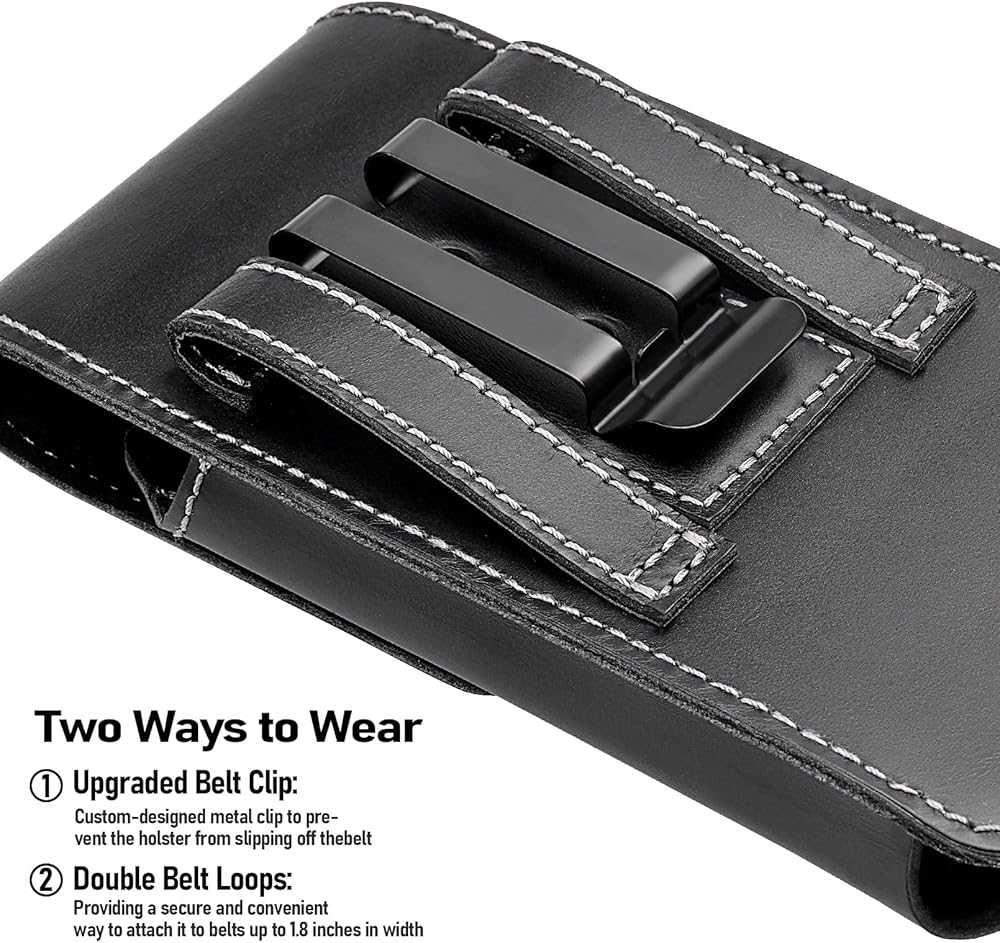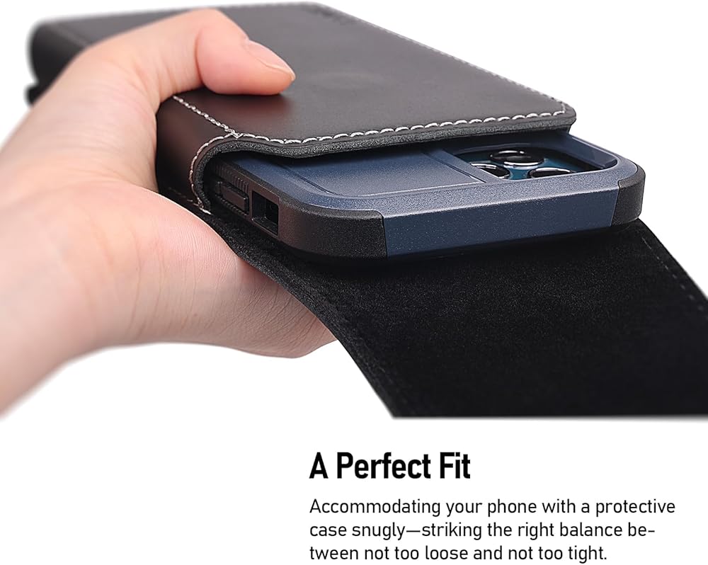 Optimal Size Compatibility: Tailored to fit the dimensions of 6.0 x 3.2 x 0.65 inches, this phone holster for belt is specifically designed for the latest iPhone 15 and 15 Pro models, even with OtterBox Commuter cases. Experience the perfect blend of form and function as your phone fits like a glove, providing easy access when needed. Premium Crazy Horse Leather: Crafted from exquisite Crazy Horse leather, our phone pouch for belt not only exudes sophistication but also ensures durability. The unique texture and high-quality finish make it a statement accessory that complements your style effortlessly. Versatile Wear Options: Designed for your comfort and convenience, this phone holster for men offers two versatile wearing options. Clip it securely to your belt using the back clip, or slide it onto a regular belt through the belt loops. Perfect for belts up to 1.8 inches wide, giving you flexibility in how you carry your phone. Secure Magnetic Closure: Our Leather Phone Holster features a reliable magnetic closure that keeps your device snug and secure. Easily access your phone while keeping it protected from the elements and ensuring it stays in place during your active lifestyle. Fashionable Utility for Everyday Life: More than just a phone holster, our product seamlessly combines fashion with utility. Carry your phone in style while enjoying the convenience of quick access. Whether you're heading to the office or going for a casual stroll, this phone belt holder is the perfect companion for those who appreciate both aesthetics and functionality.